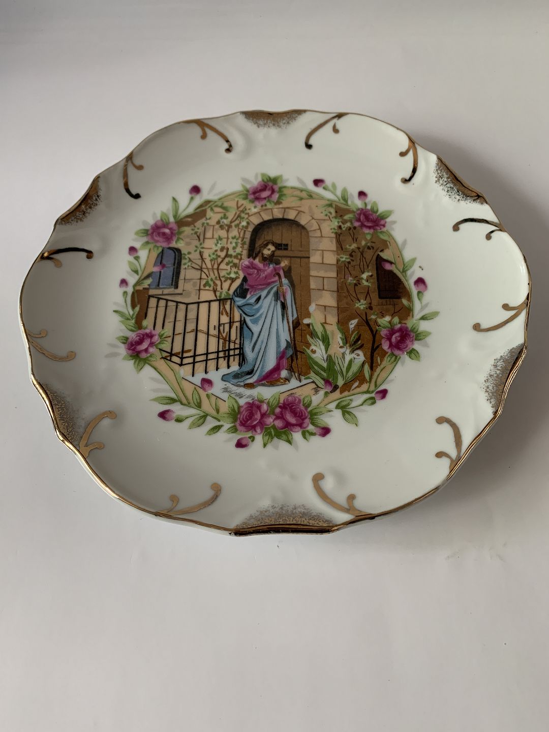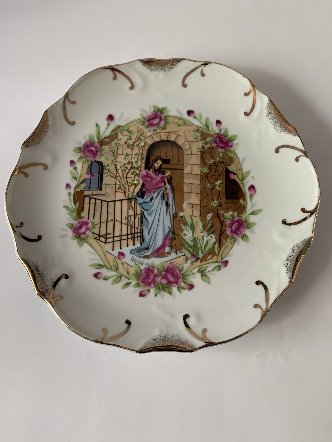 Smuk platte med religiøst motiv, der forestiller Jesus som budbringeren. Platten er med 18 karat guldkant, der gør platten til noget ganske særligt. Platten er lavet med sans for detaljerne, og de flotte detaljerede tegninger giver platten et smukt og enkelt udtryk.