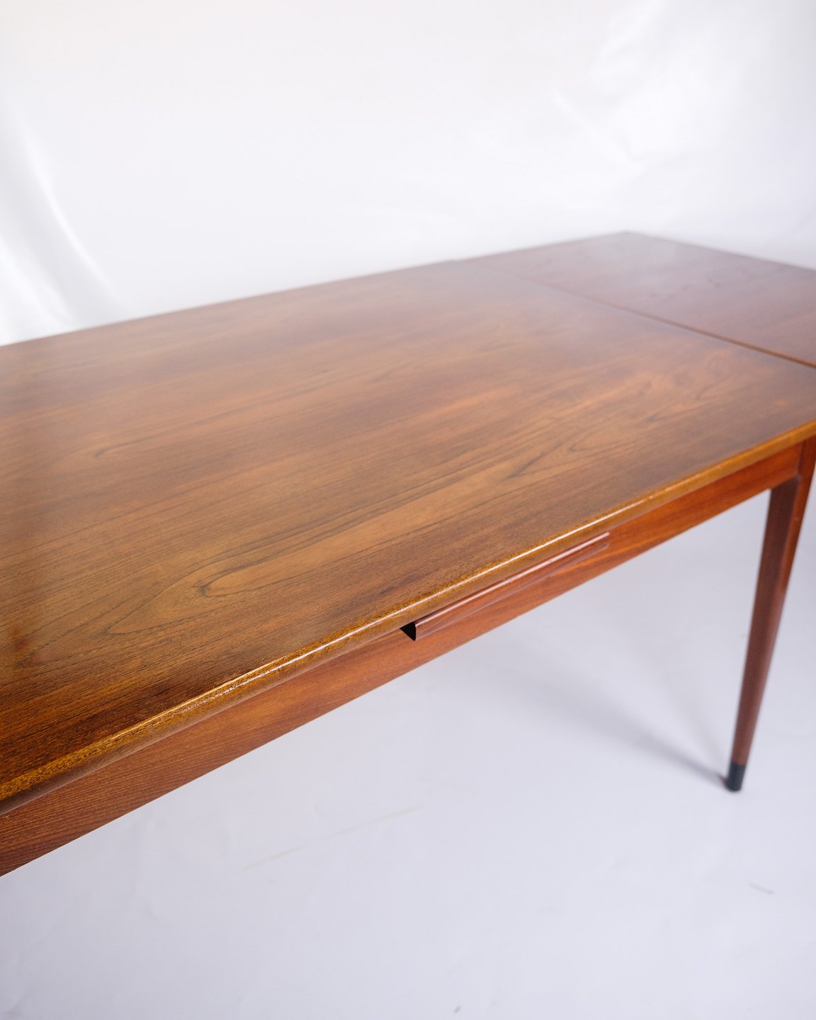 This dining table with extension, made of teak and designed in the 1960s, is a beautiful example of Danish mid-century modern design. The table combines elegance, functionality and durability, making it an ideal addition to any modern home.