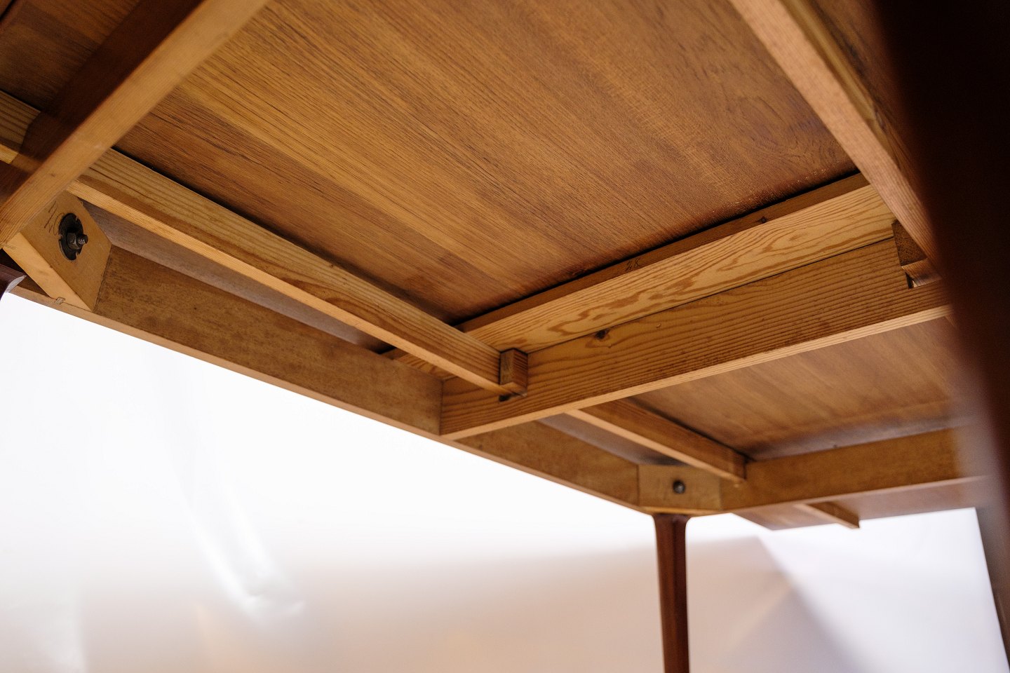 Teaktræet, der anvendes i dette bord, er kendt for sin holdbarhed og varme, rige tone. Træets naturlige skønhed fremhæves af en fin finish, der både beskytter træet og fremhæver dets unikke åretegninger. Teak er et populært materiale i mid-century design på grund af dets styrke og æstetiske kvaliteter, hvilket sikrer, at bordet kan modstå daglig brug samtidig med at det ser smukt ud.