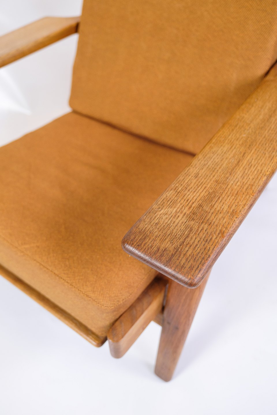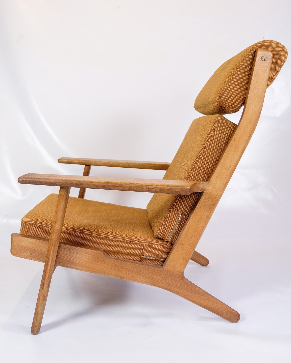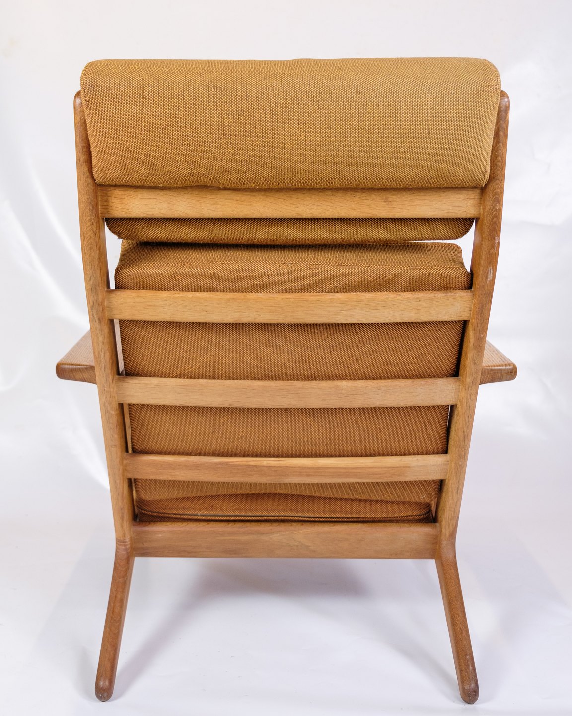 This armchair, model GE290A with high back, designed by Hans J. Wegner and manufactured by Getama in the 1960s, is an excellent example of Danish mid-century modern design. The chair combines solid oak with yellow fabric, creating an elegant and comfortable piece of furniture that reflects Wegner's unique design philosophy and craftsmanship.