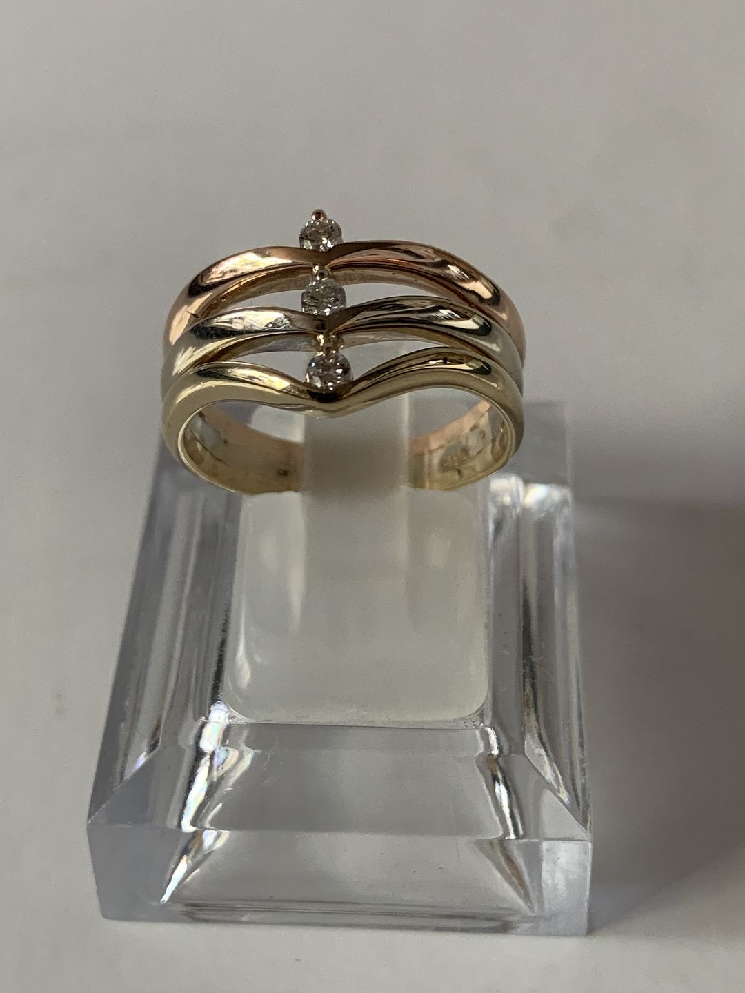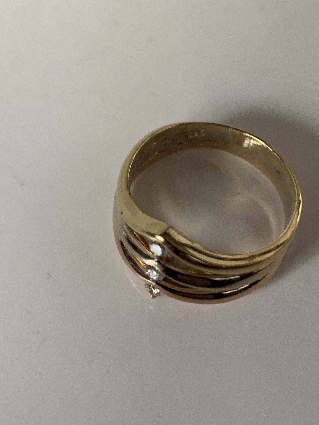 Damering i 14 karat, 3-farvet hvid- og rødguld med brillanter. Stemplet 585. Str. 58
