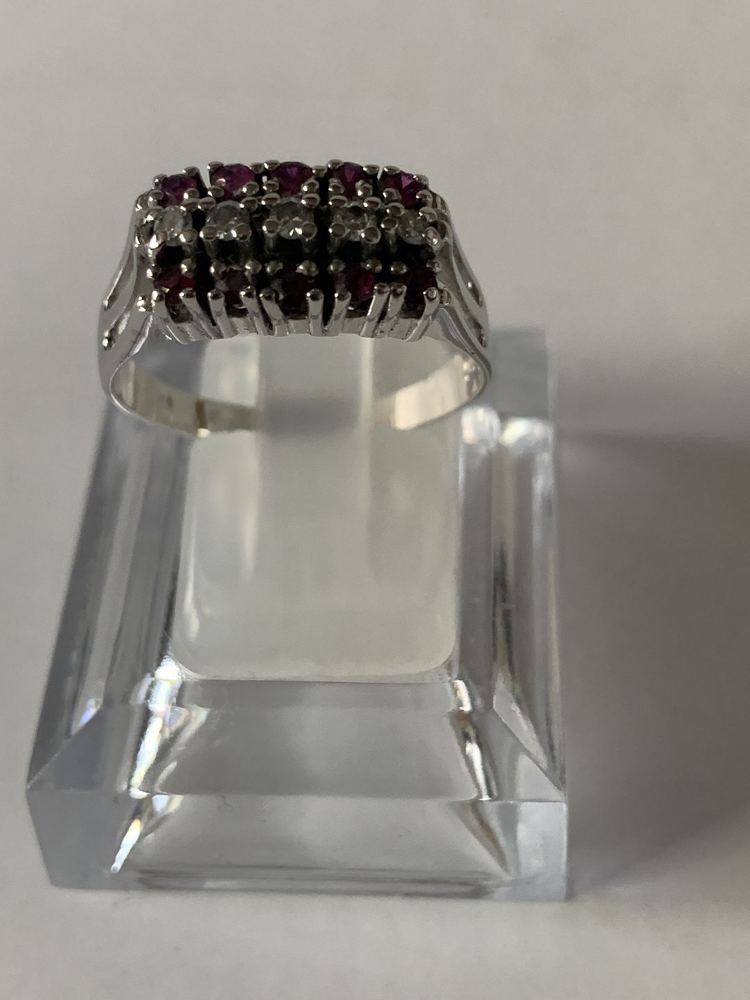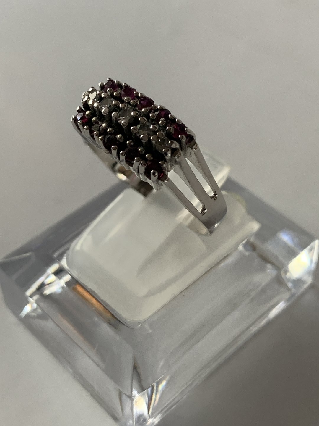 Damering i 14 karat hvidguld, med brillanter og røde rubiner. Str. 61