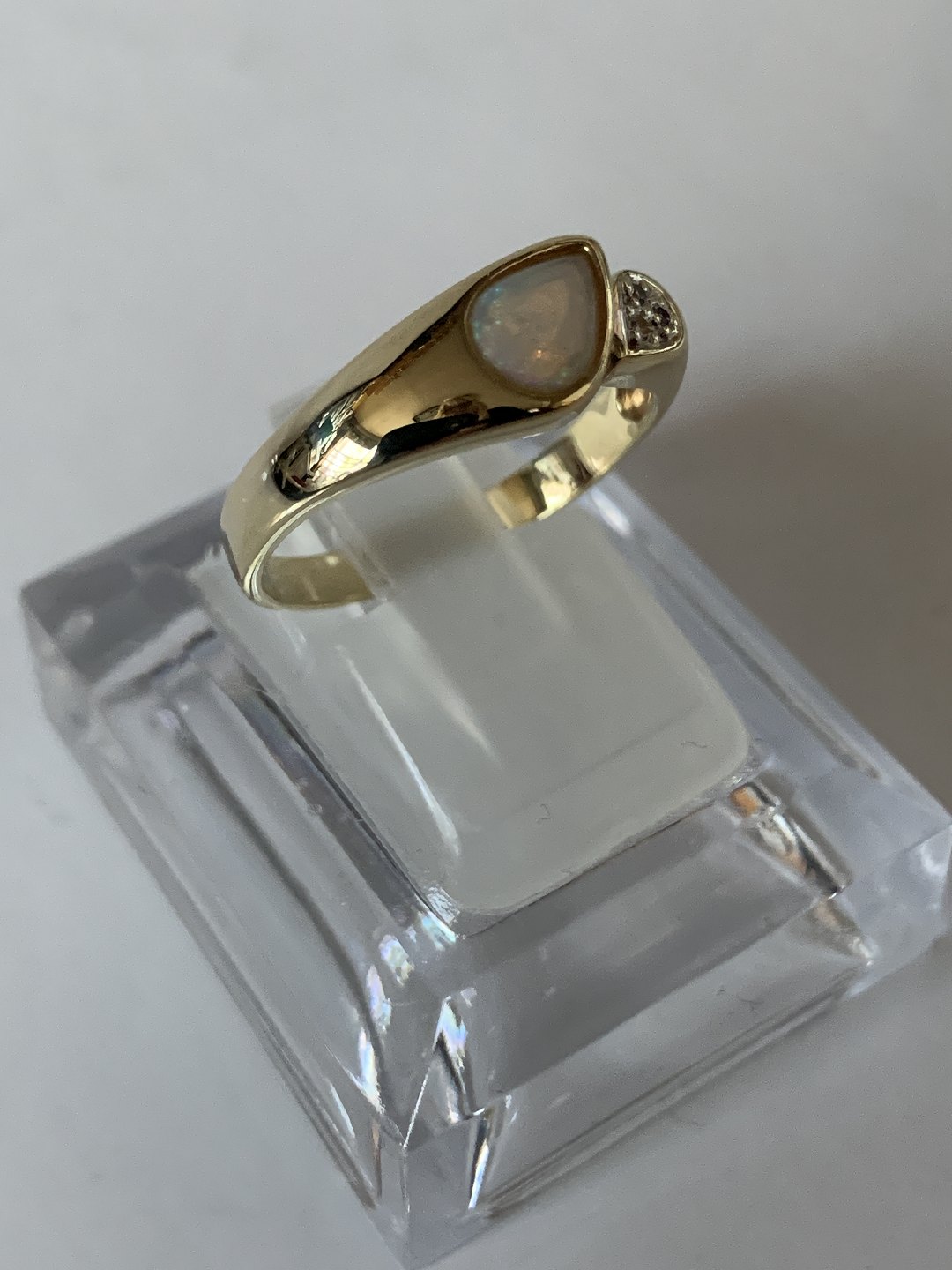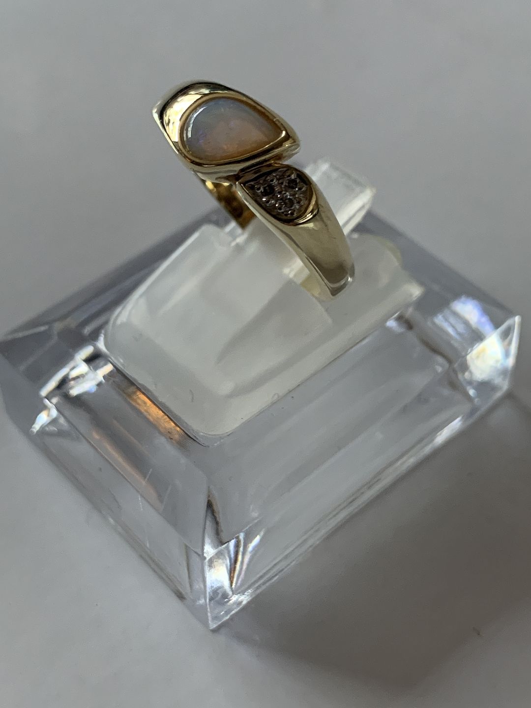 Damering i 14 karat guld, med opal-lignende sten og brillanter. Stemplet SC 585. Str. 56.