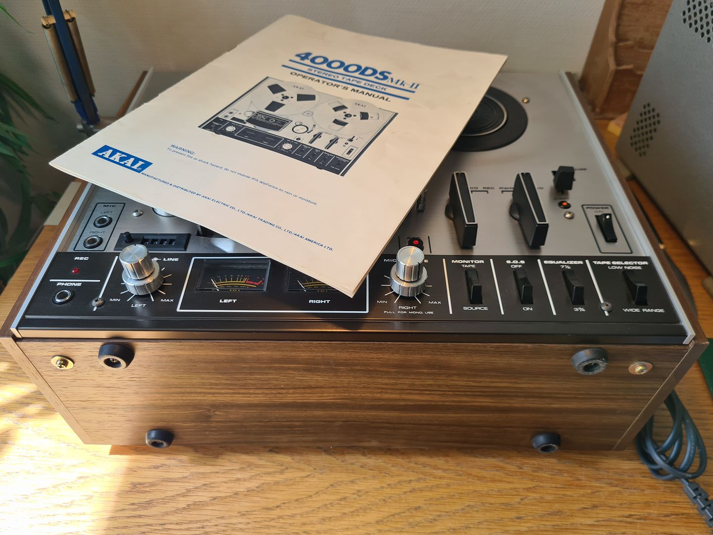 Text available in Danish: AKAI Spolebåndoptager model 4000DS MK-II. Pæn original stand og spiller helt fint. Original manual medfølger.