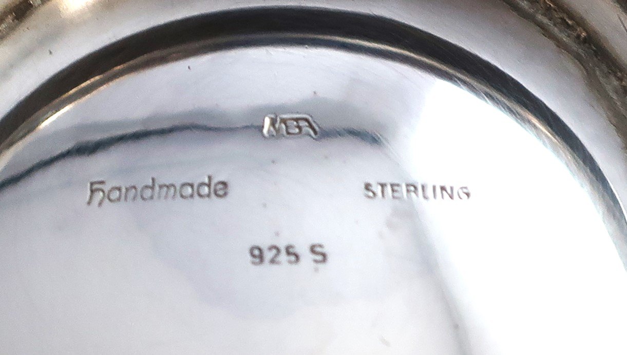 Mogens Bjørn Andersen (MBA). Rund sterling sølvskål med 5 grønne sten. Diameter 16,5 cm