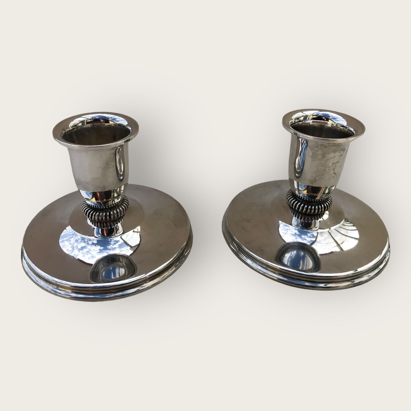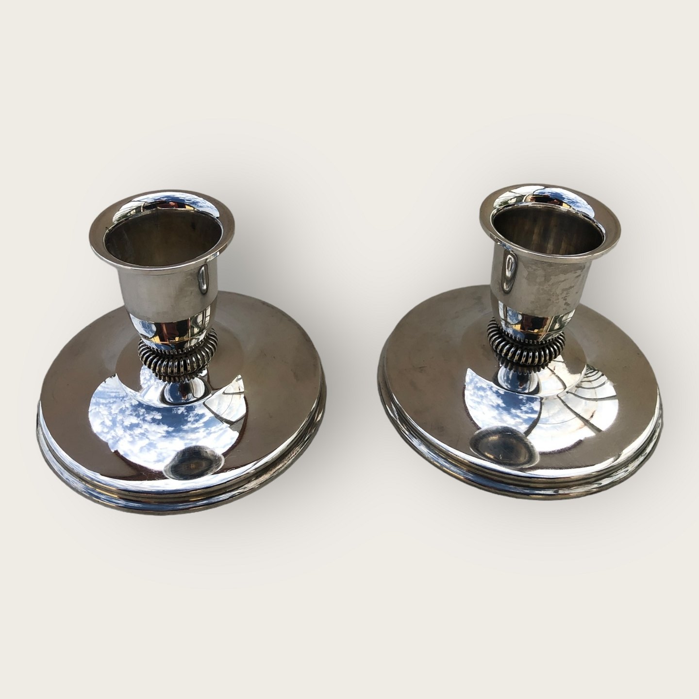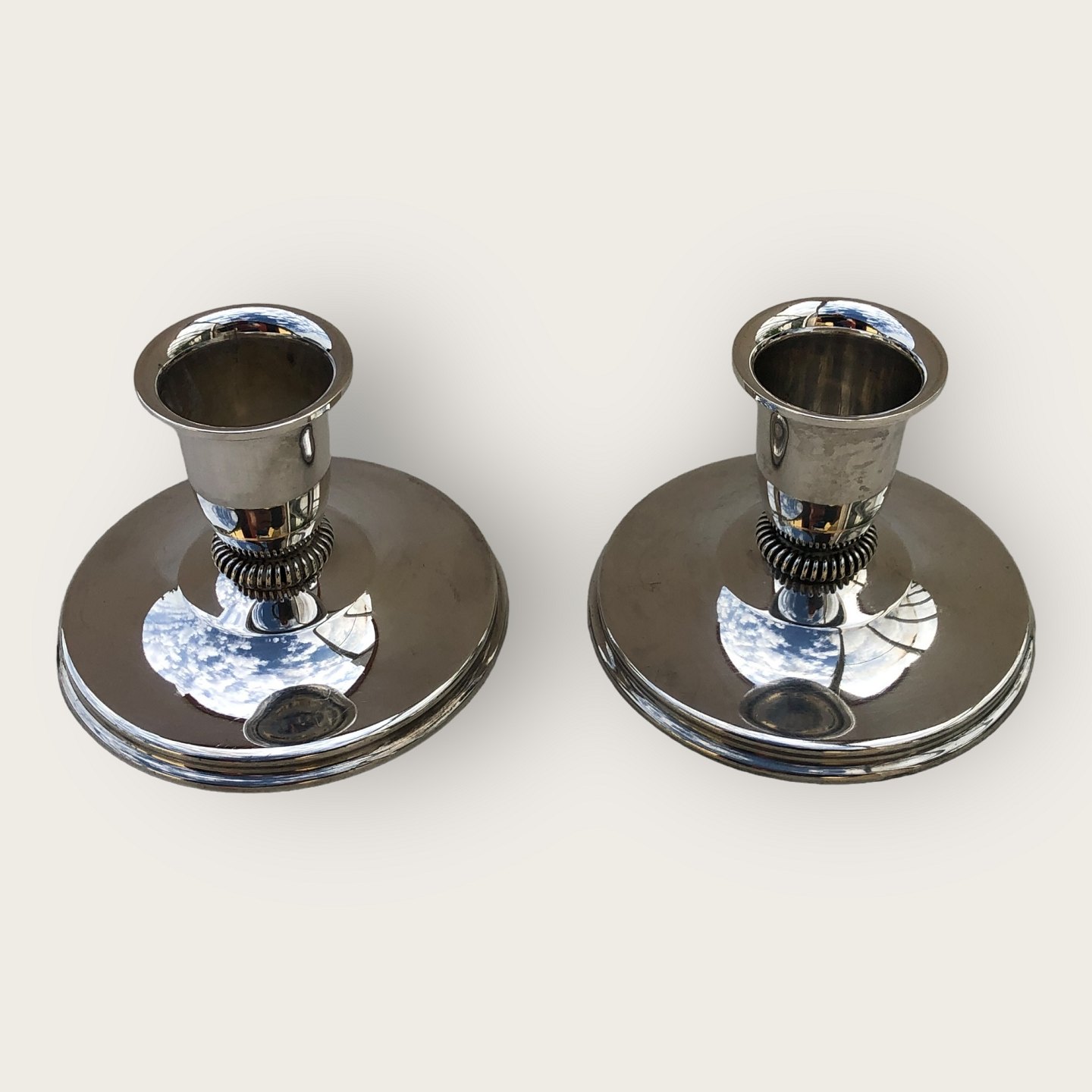 Sterling sølv lysestager fra 1961, stemplet 925S, udfyldte, meget lille bule på en stage (se foto) ellers pæn patineret stand. Højde: 5,5 cm, diameter 8 cm.