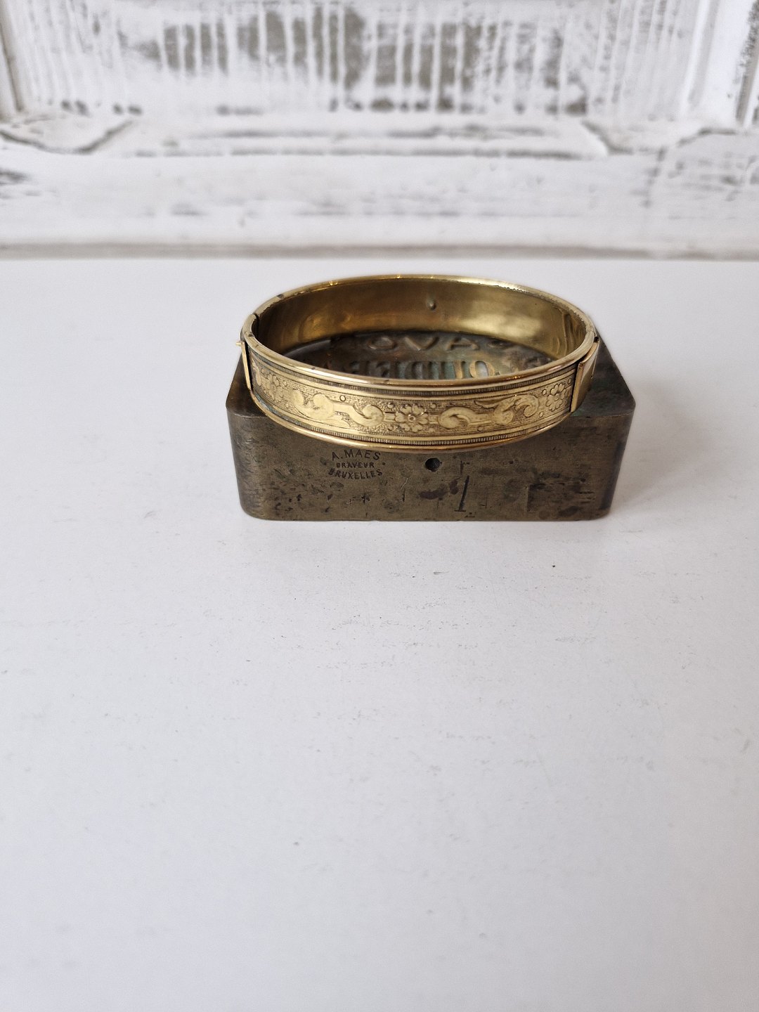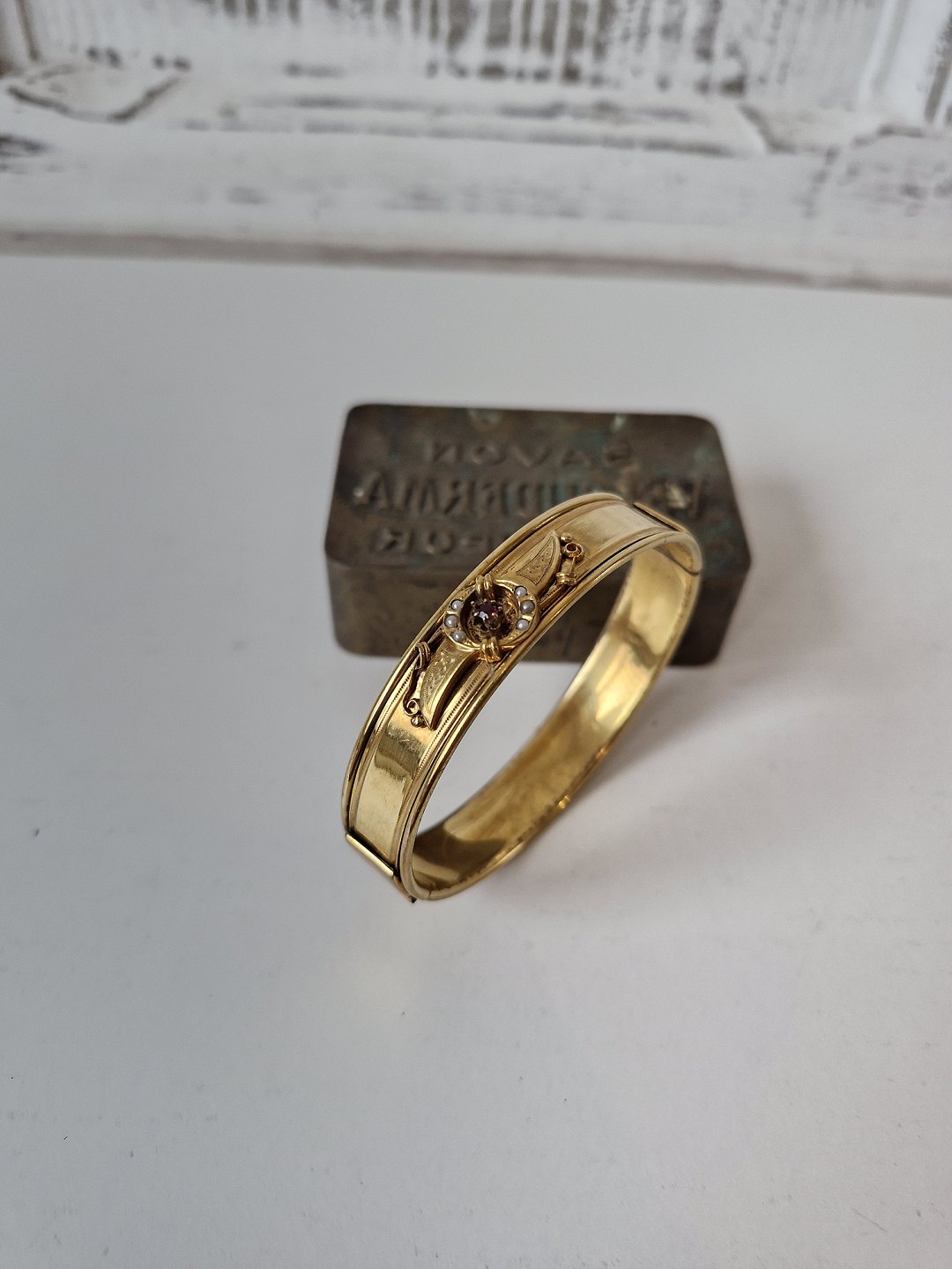 Victorian bangle in gold-plated metal adorned with a garnet and small pearls