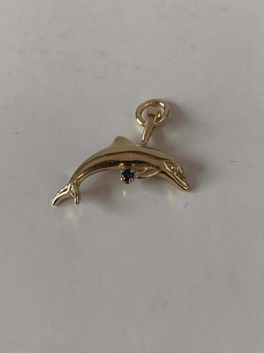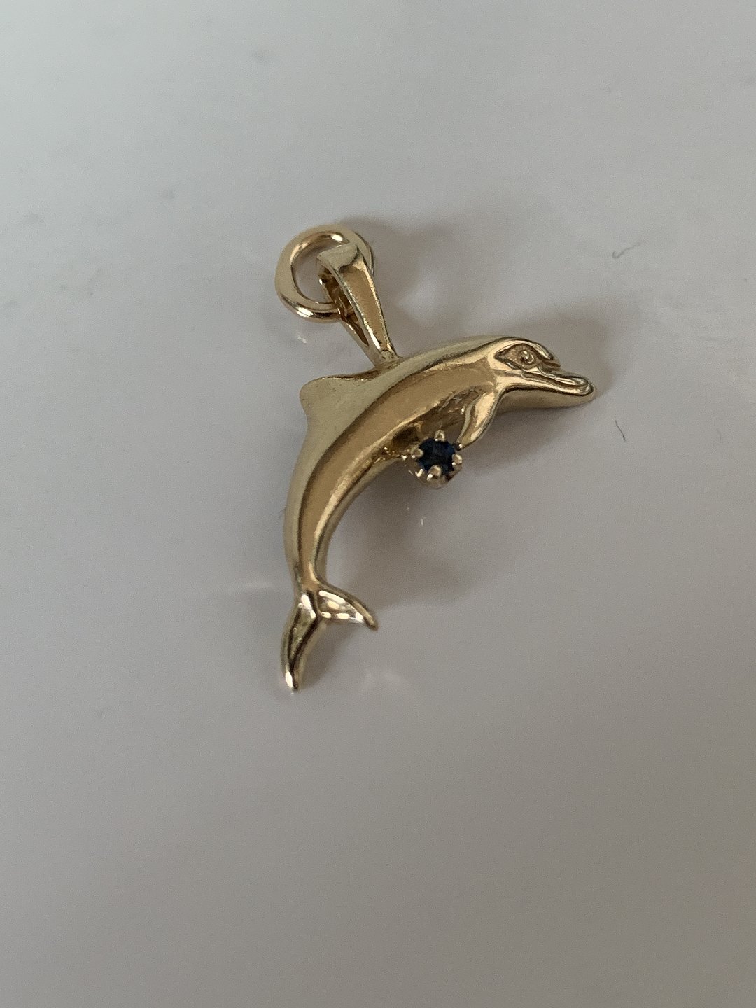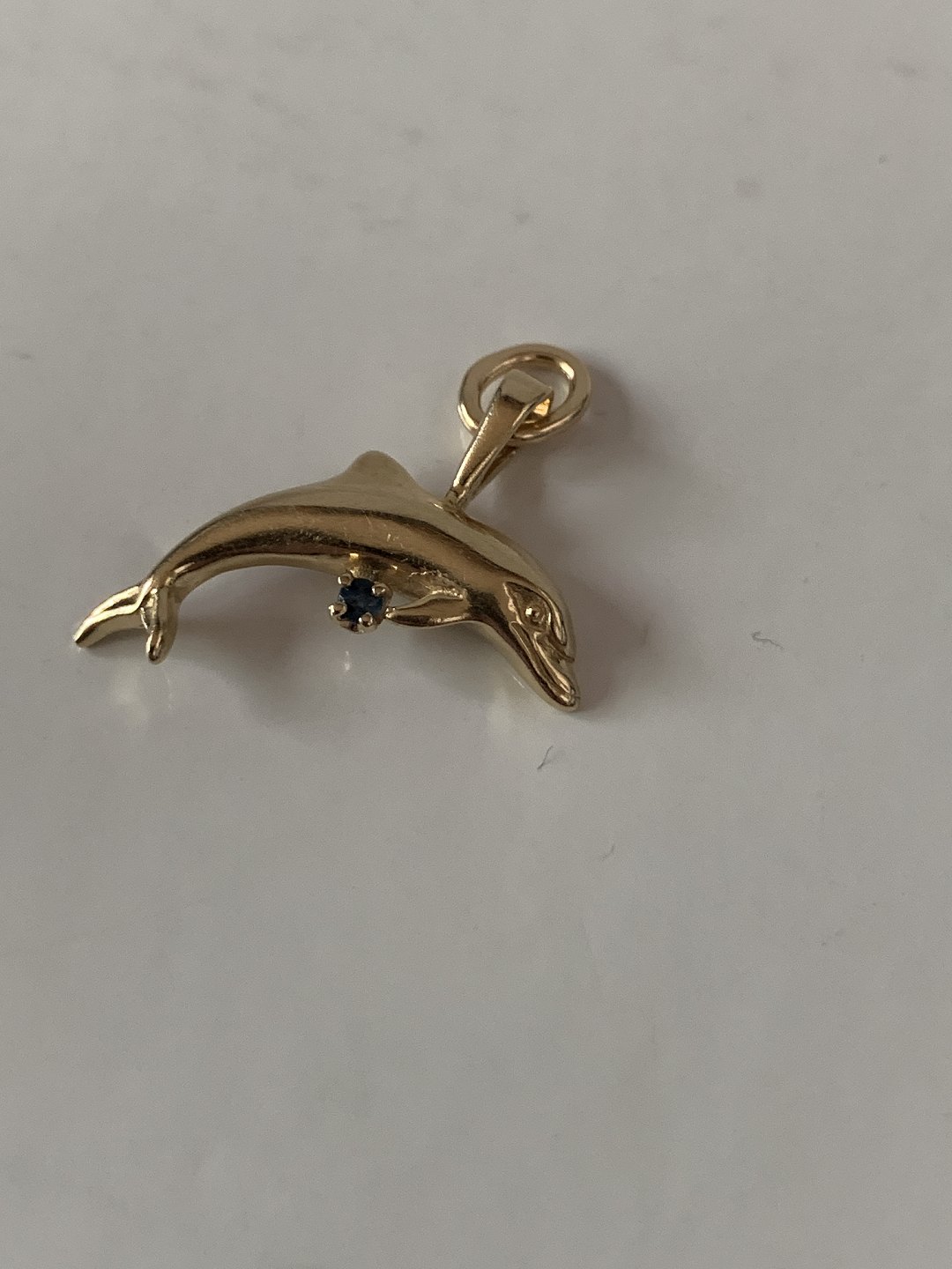 Pendant 14 carat gold, shaped like a dolphin with blue sapphire