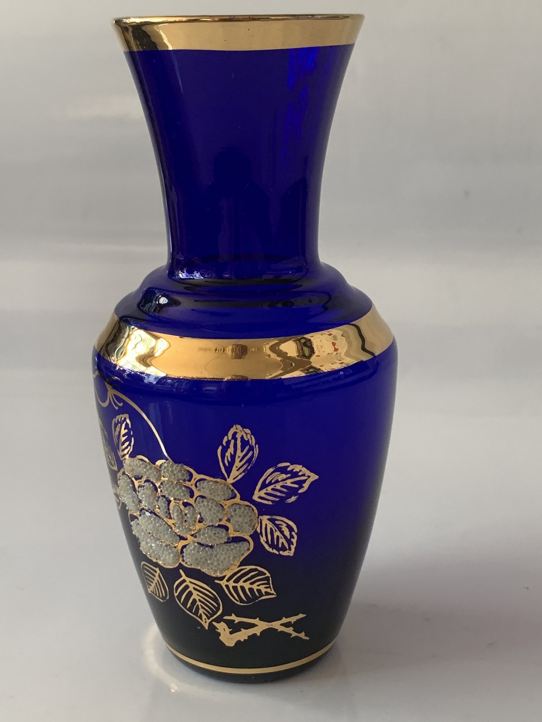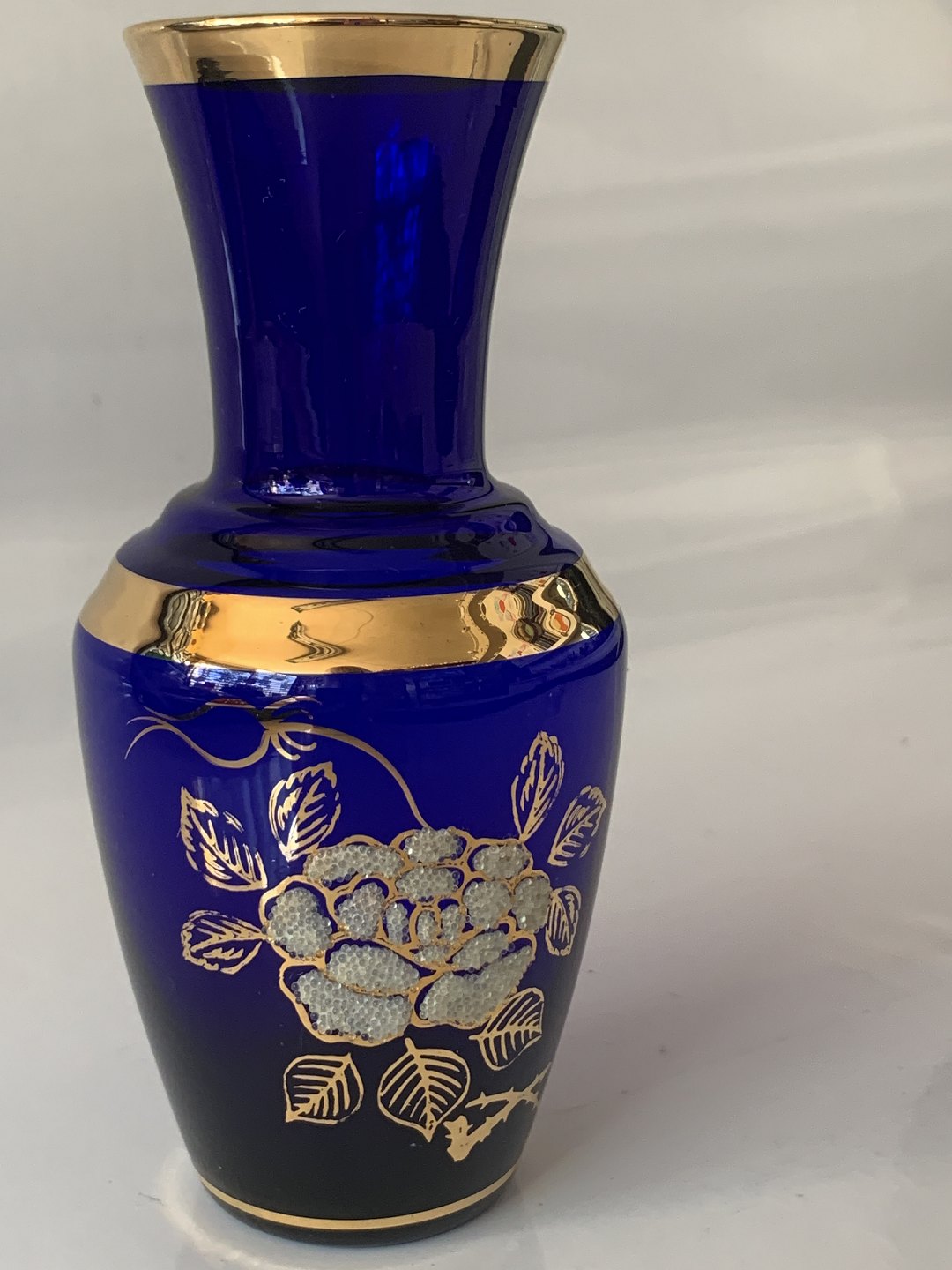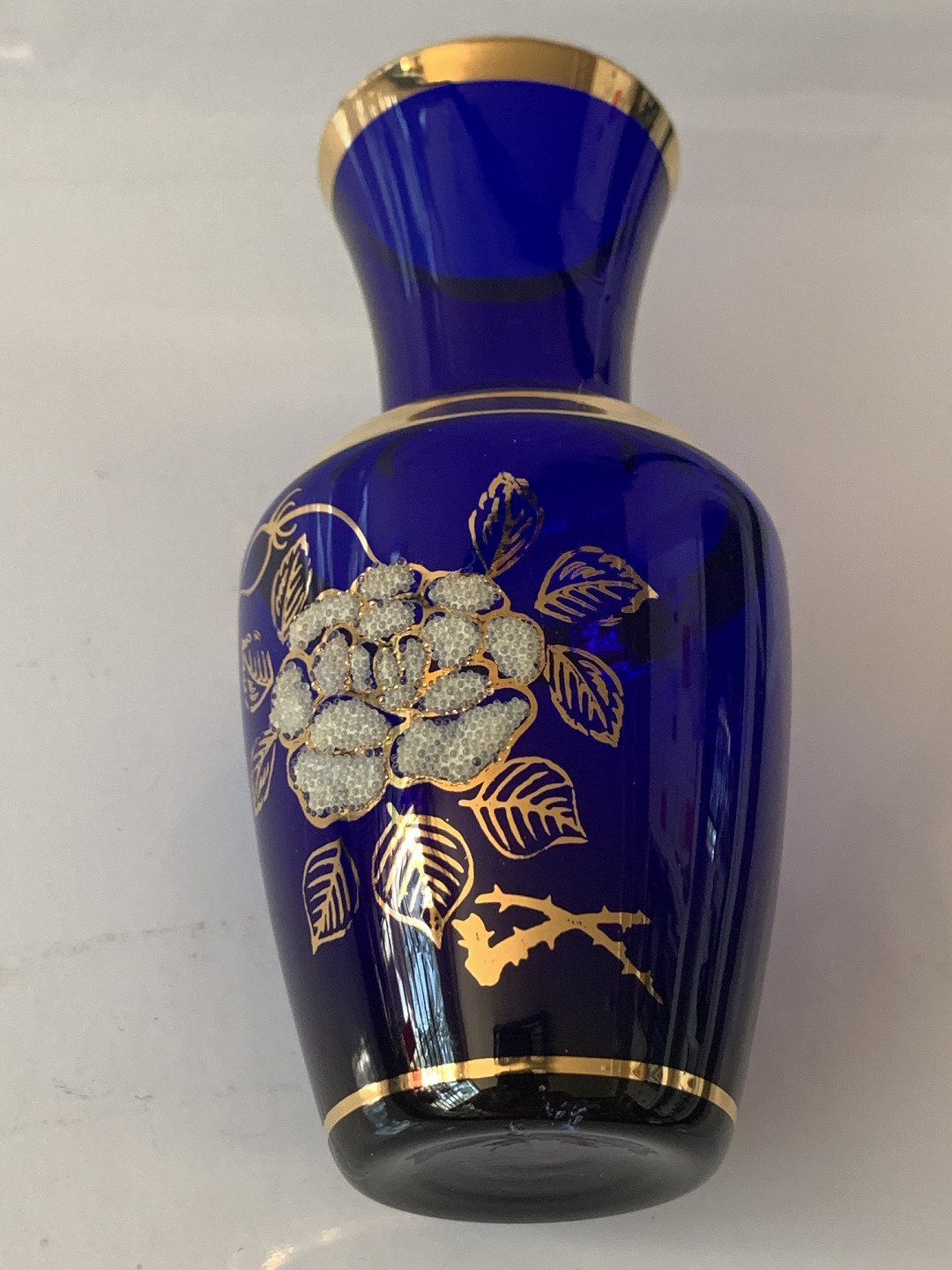 Smuk lille vase med elegant guldkant og blomsterkunst. Vasen har en flot dyb blå farve, der giver vasen et elegant udtryk. Vasen er oplagt til kontorboret eller i vindueskarmen med et par flotte markblomster.