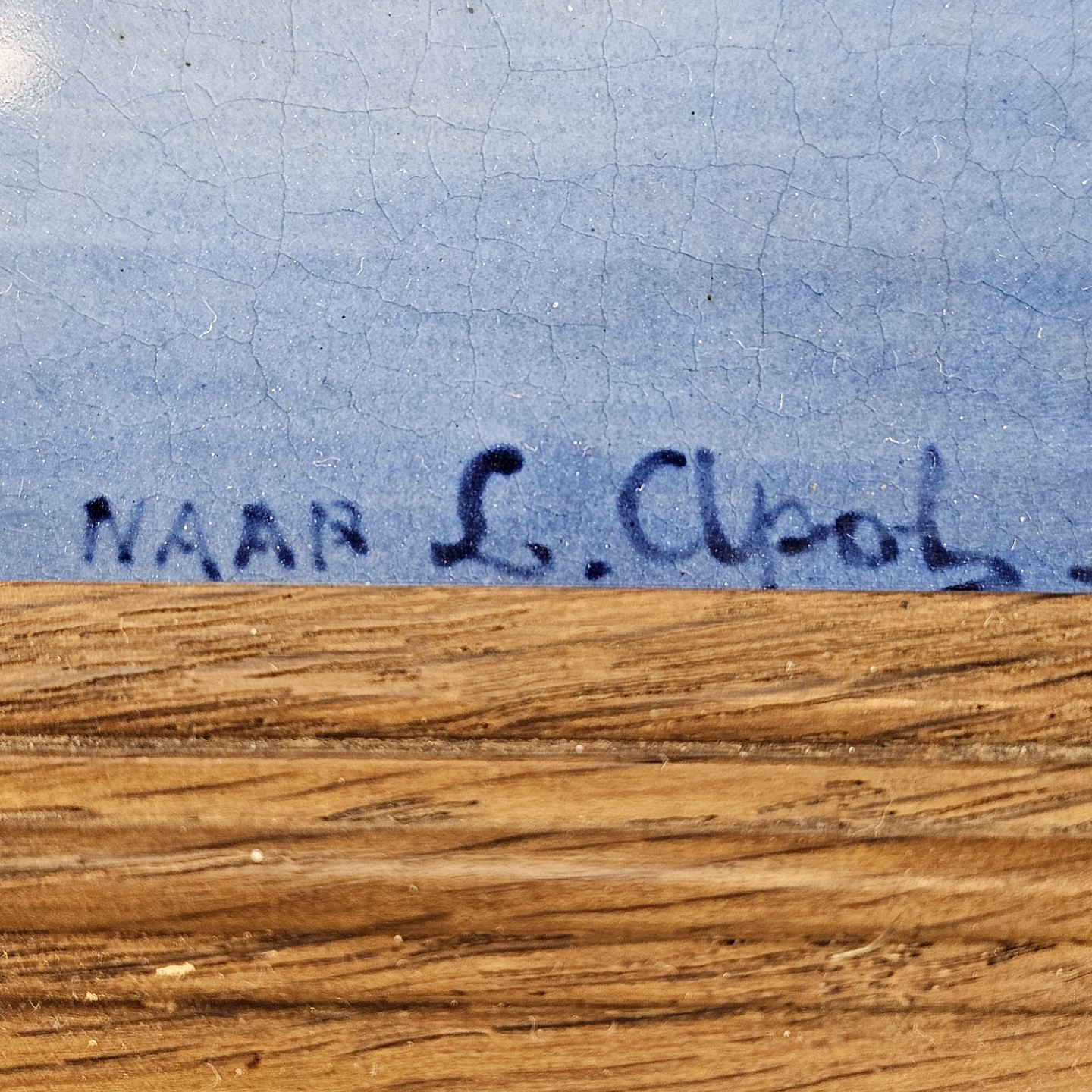Maleri på flise af fajance i ramme. Fra 1931. Motiv af vandkant, mølle og flodpramme