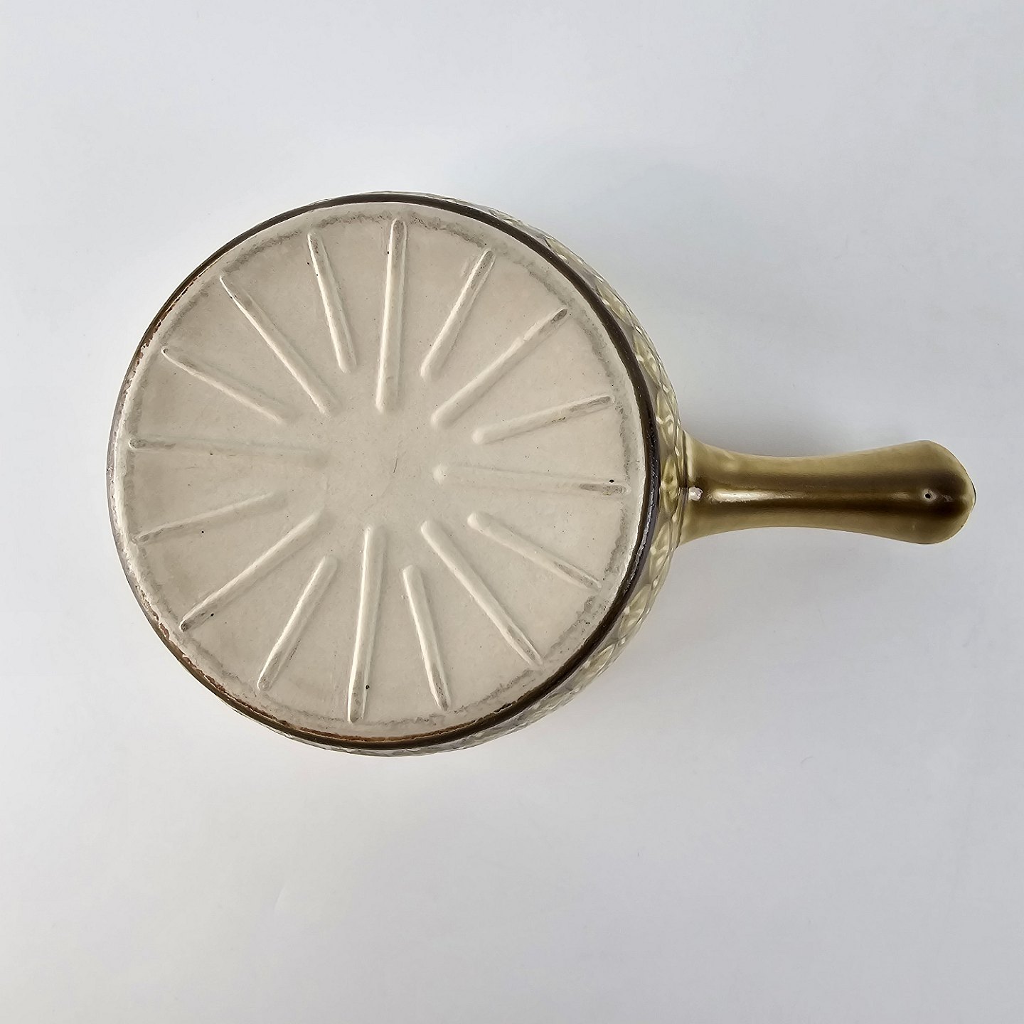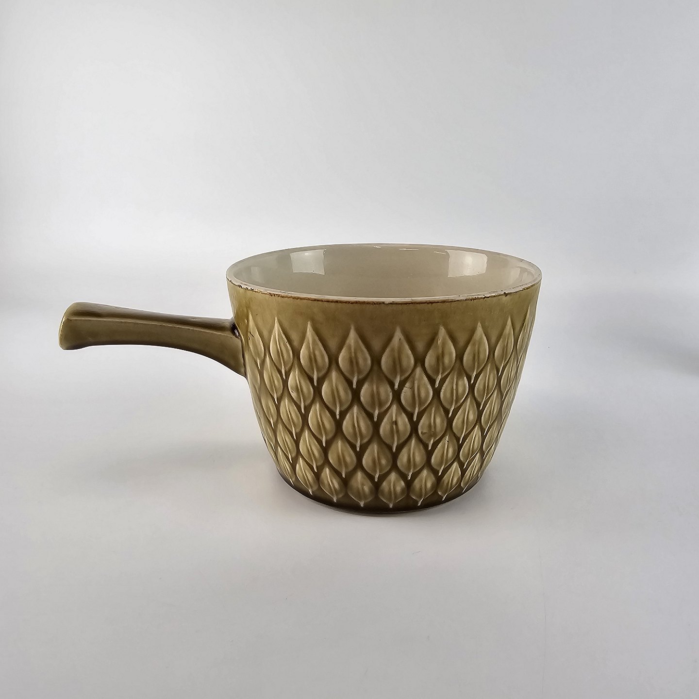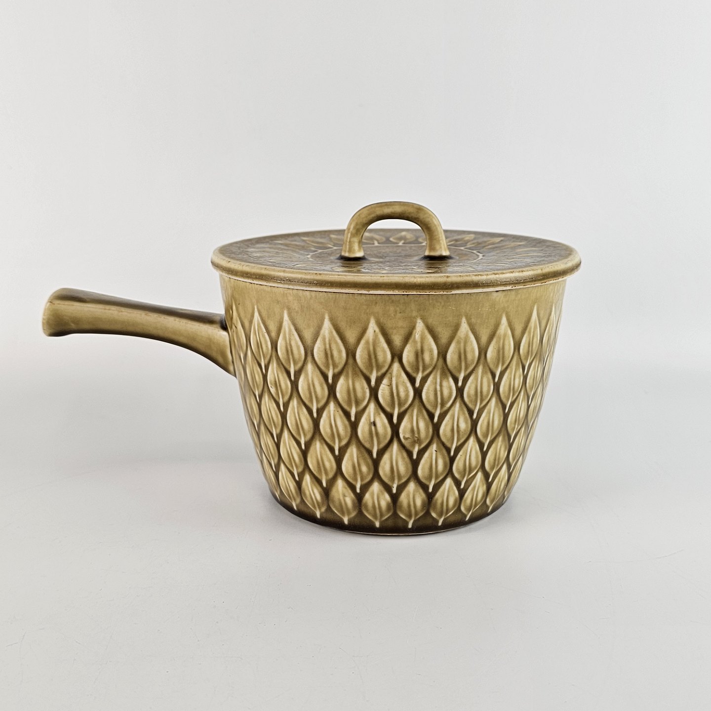 Gult stentøj med mønster af blade. Brugsspor kan forekomme