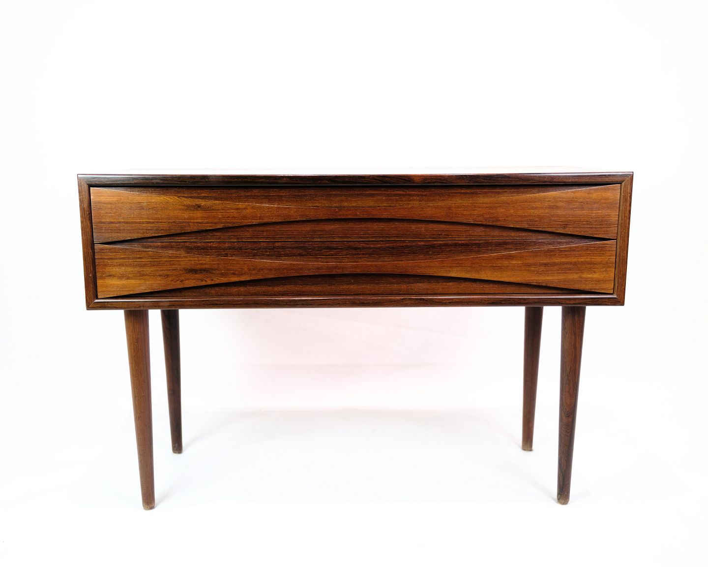 Kommode/skænk i palisander, designet af Niels Clausen for NC Møbler Odense i 1960'erne. Fremstillet med fokus på elegante linjer og kvalitetsmaterialer, er denne kommode et smukt eksempel på Niels Clausens funktionelle og æstetiske design. NC Møbler Odense er kendt for deres dygtige håndværk og produktion af tidløse møbler i høj kvalitet.