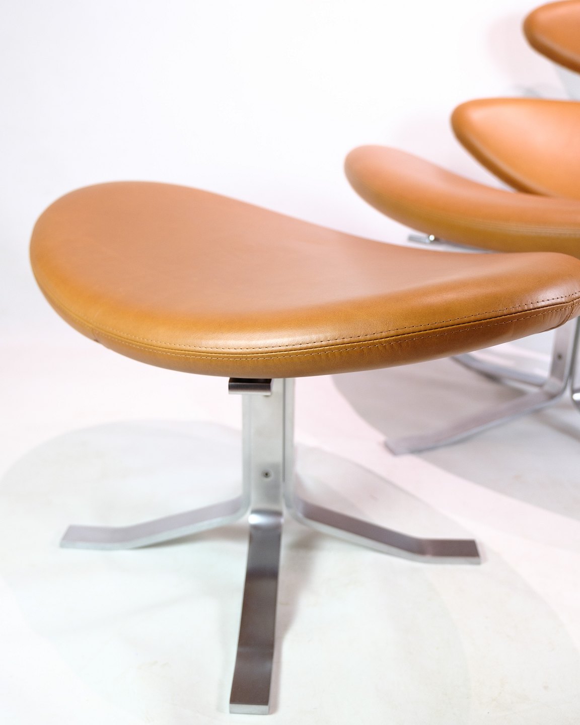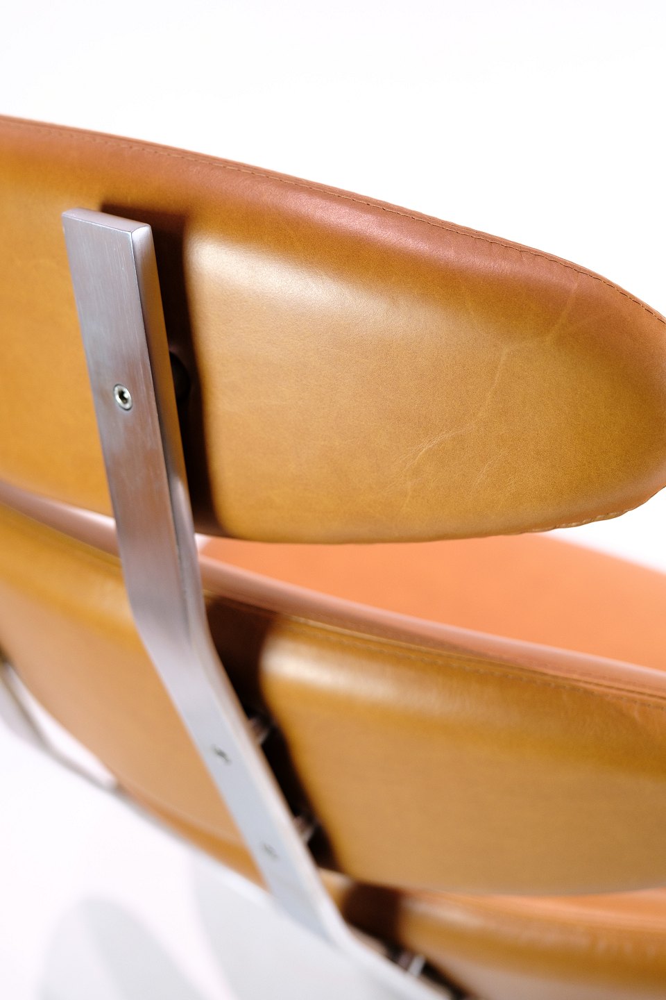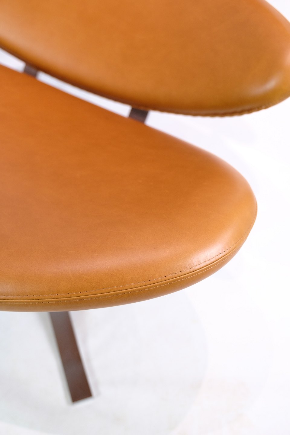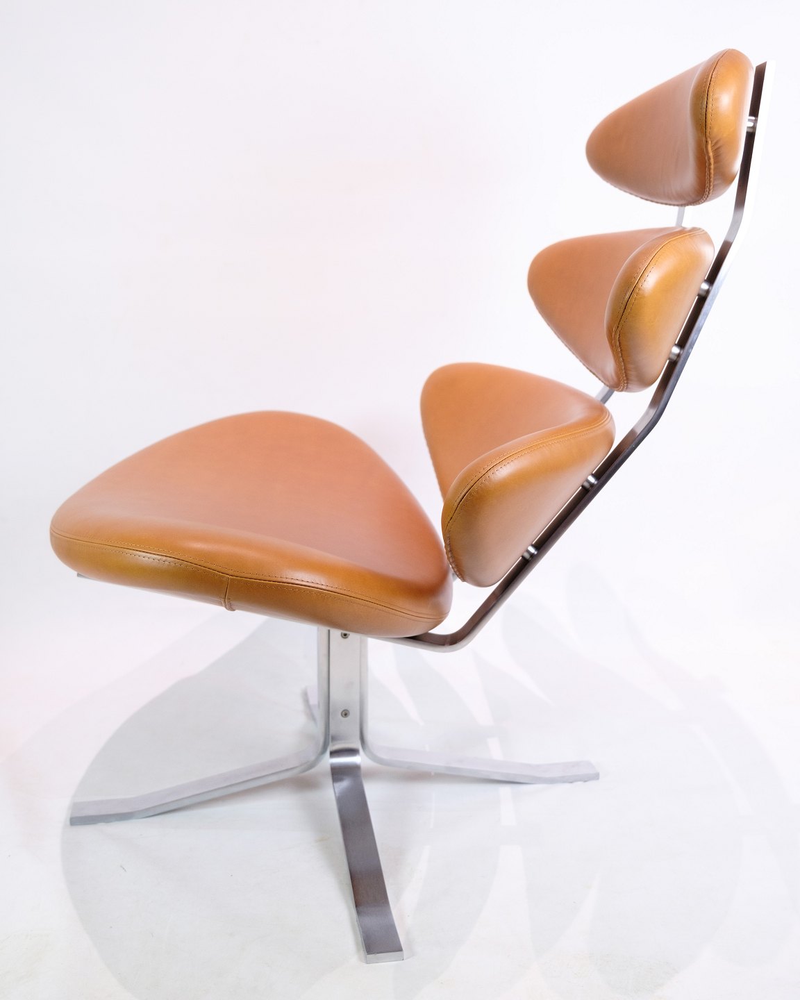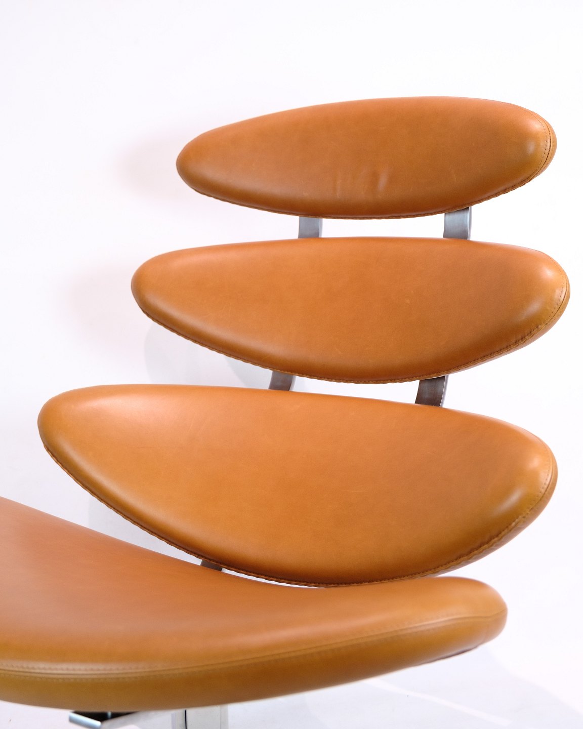 The Corona recliner with stool, model EJ 5, upholstered in Walnut Elegance leather, designed by Poul M. Volther for Erik Jørgensen in the 1960s. The chair is known for its unique shape and comfort. Poul M. Volther was a pioneer in Danish furniture design, and Erik Jørgensen is known for his focus on quality and craftsmanship.