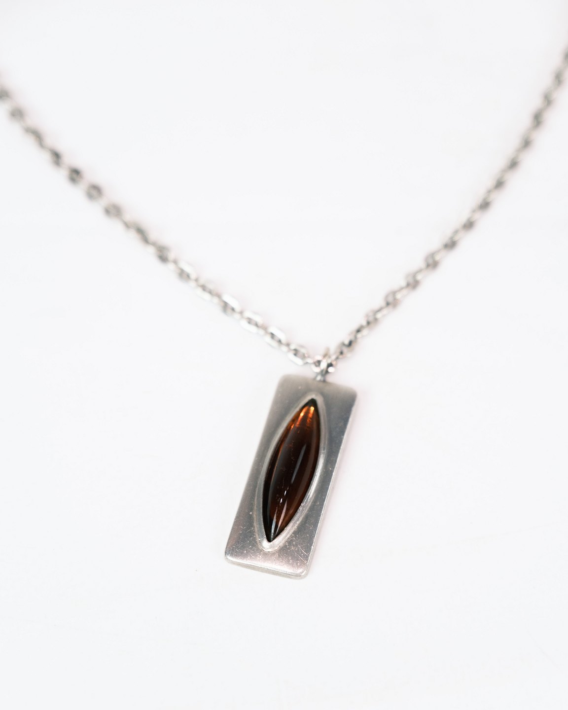 Halskæde i tin, udsmykket med rav og med kæde af sølv, designet af Jørgen Jensen i 1960'erne. Jørgen Jensen, kendt for sine smykker i pewter, skabte værker, der elegant forenede enkelhed med naturens elementer. Denne halskæde kombinerer det varme rav med det kølige tin, mens sølvkæden tilføjer et ekstra lag af raffinement, hvilket gør den til et tidløst og stilfuldt smykke fra 1960'erne.