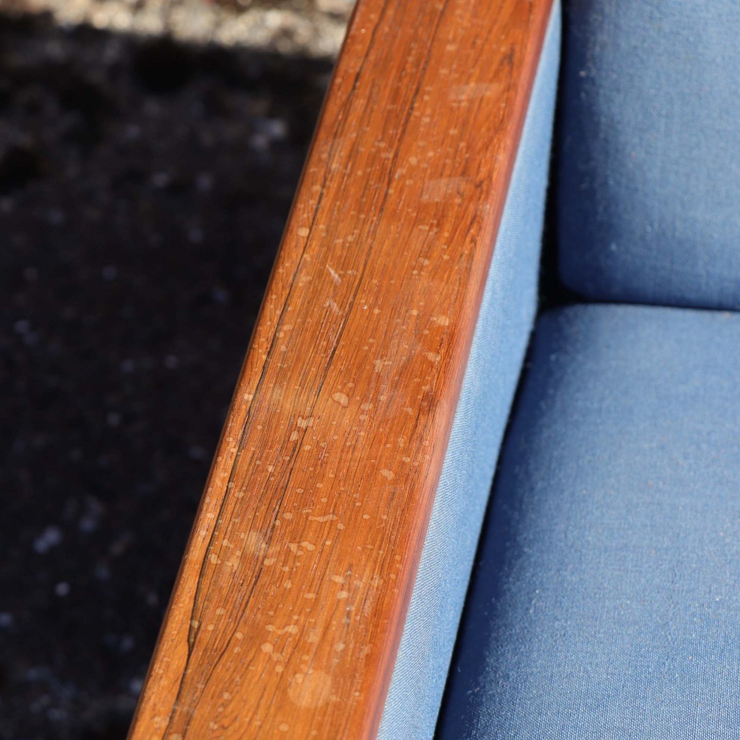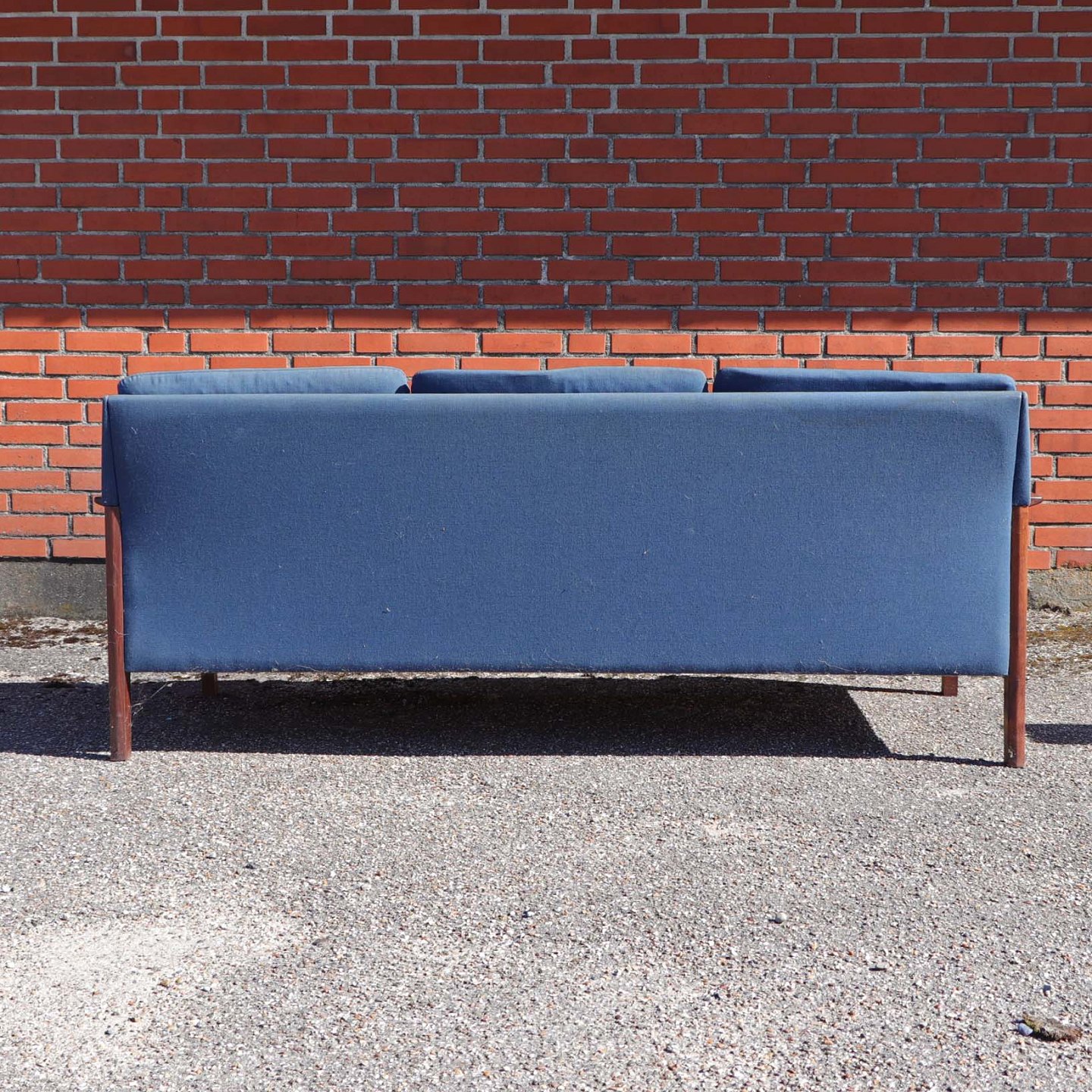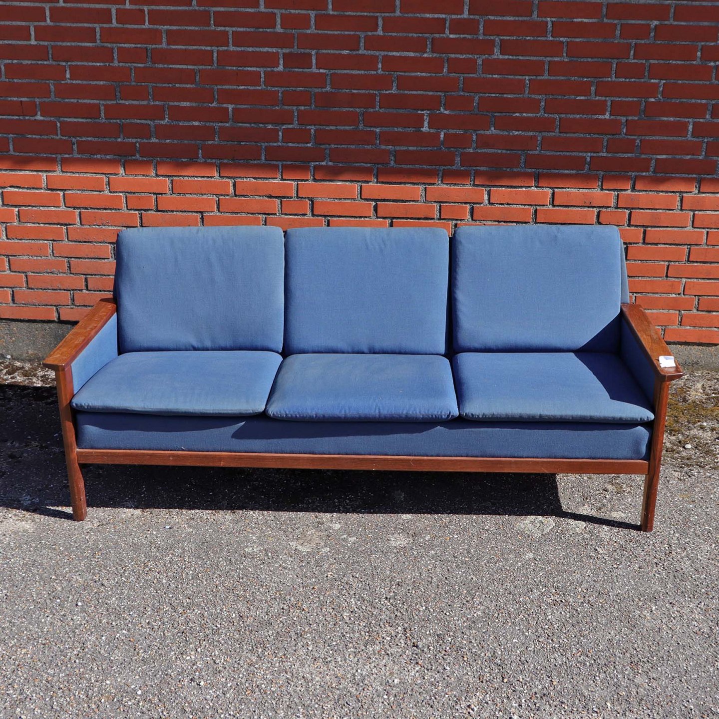 Tre personers sofa med stel i lakeret palisander med hynder i blåt betræk. Sofaen trænger til nyt skum i hynder samt nyt stofbetræk.