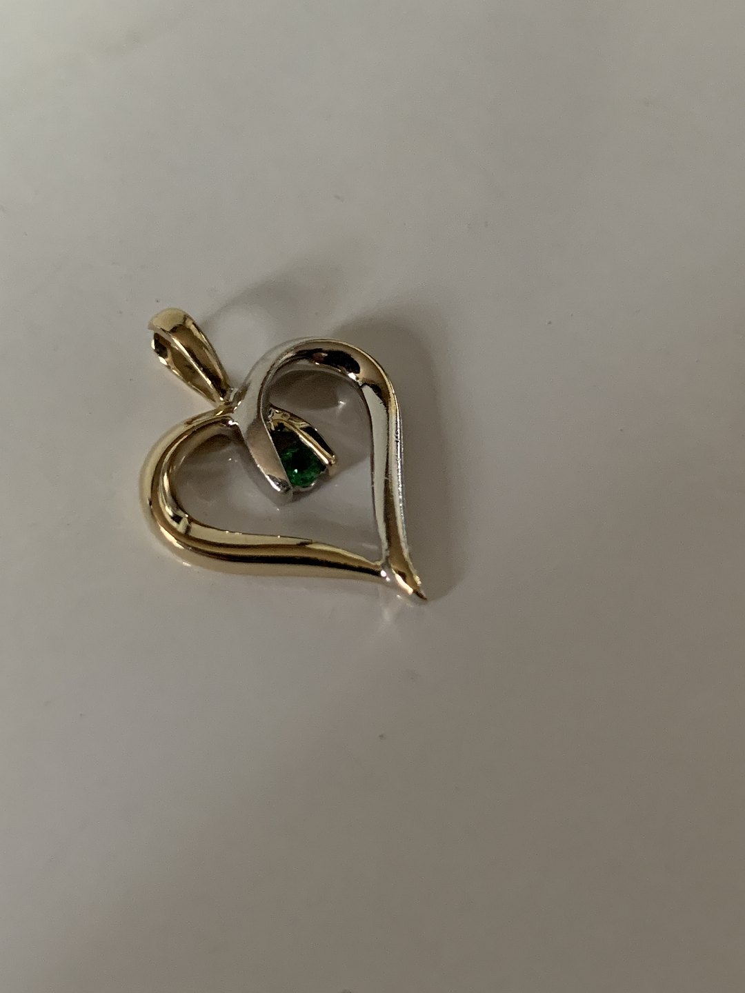 Smukt hjerteformet vedhæng i 14 karat Rød-Hvidguld, med indlagt smaragd. Dette vedhæng vil passe perfekt i en tynd kæde om halsen, og det vil være diskret men samtidig elegant. Vedhænget er udformet elegant og minimalistisk, og giver vedhænget et flot look. Kan med fordel kombineres med et guldarmbånd.