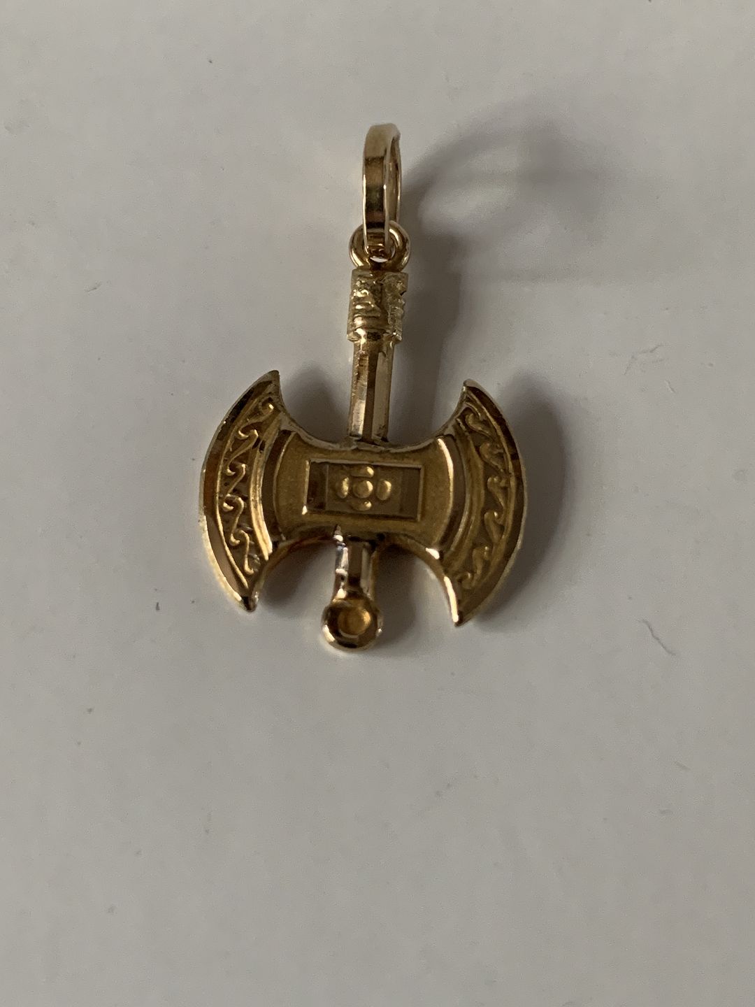 Vedhæng i 14 karat guld, udformet som dobbelt økse- strids økse, og med flotte detaljer og mønstre. Vedhænget udstråler stor energi og styrke. Vedhænget er lavet med mange fine detaljer, der vil komme fuldt til udtryk hvis man kombinerer vedhænget med en massiv guldkæde.