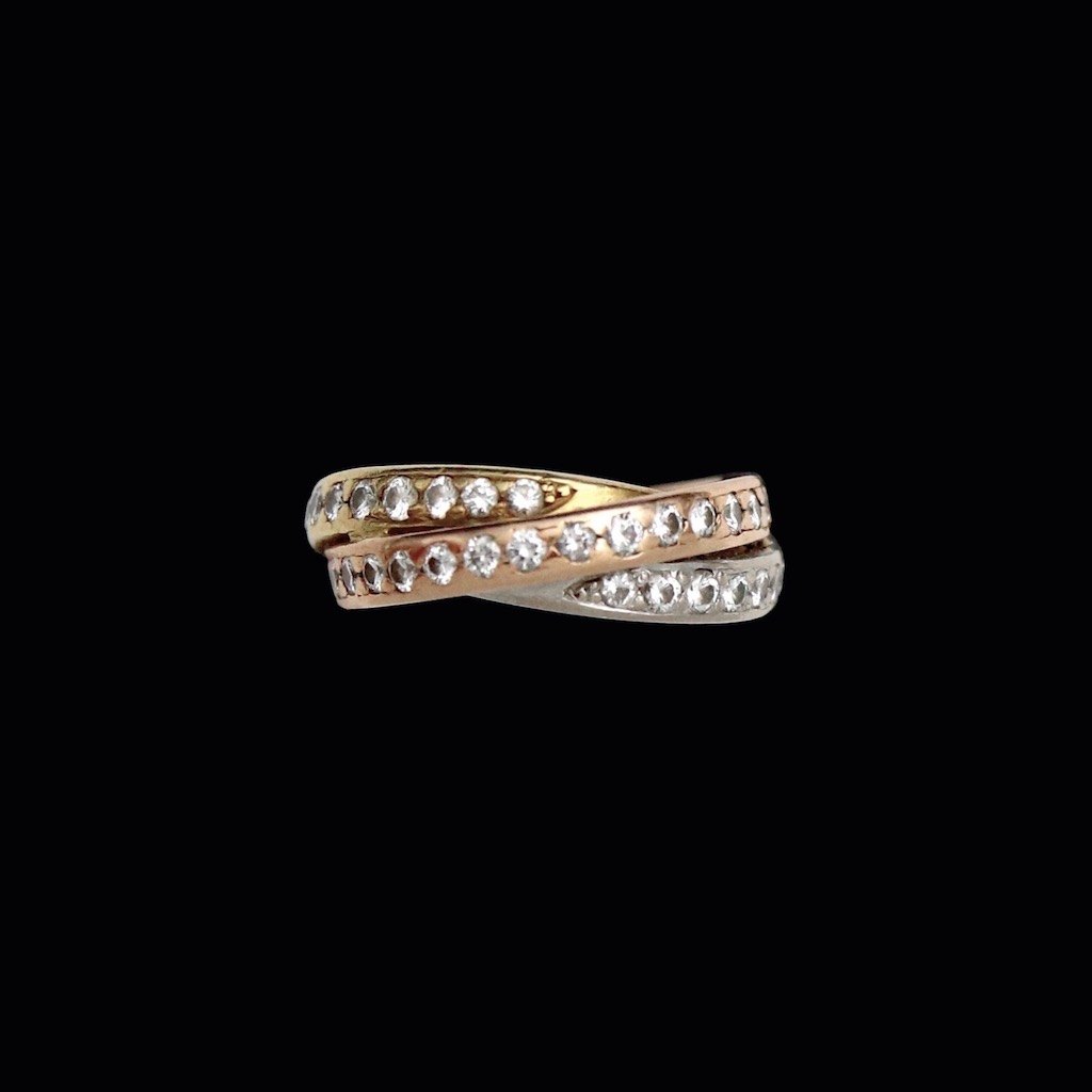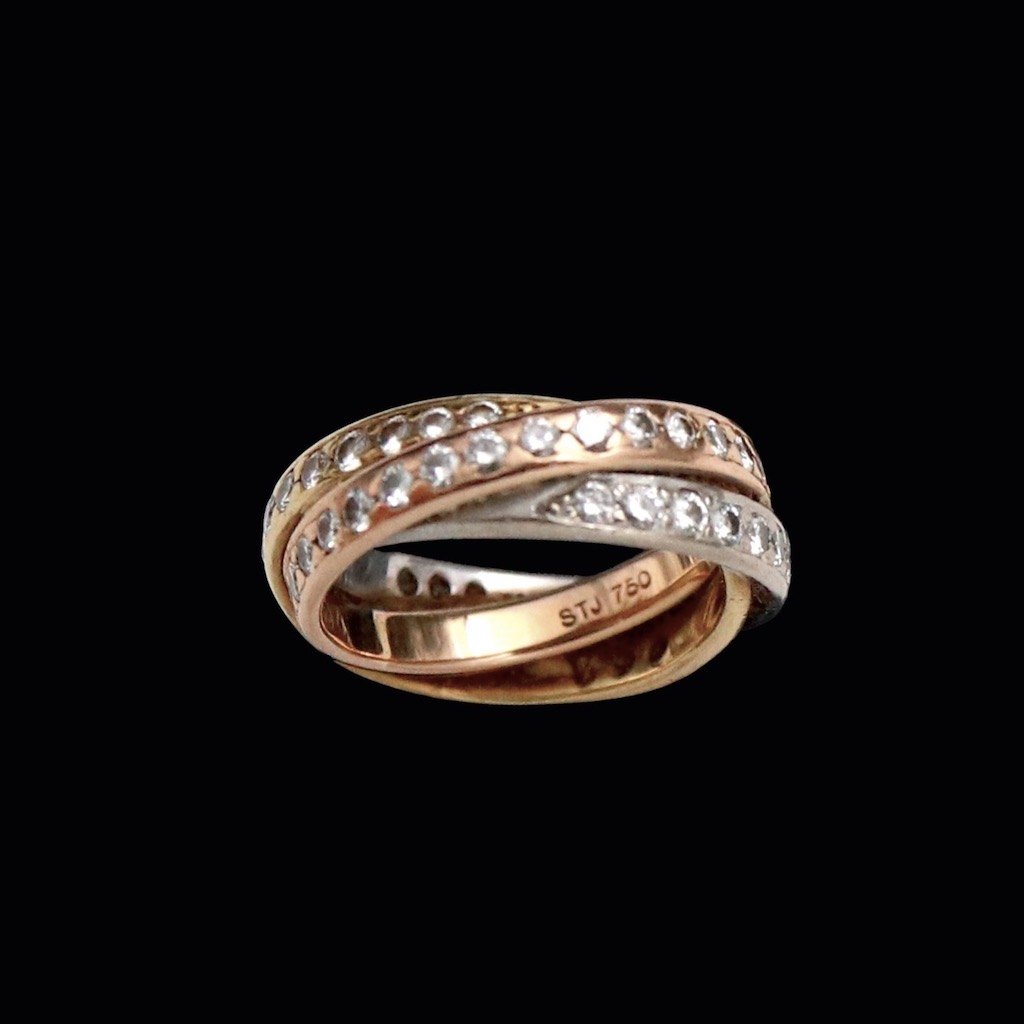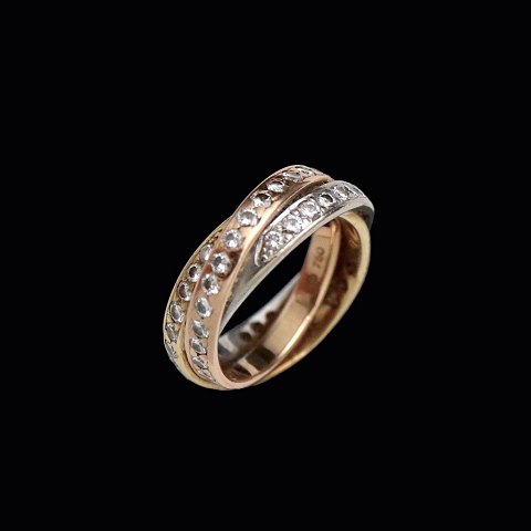 Stenstrup juveler - Copenhagen. Triple diamantring i 18k guld, hvidguld og rosaguld med talrige diamanter på hver 0.03ct.