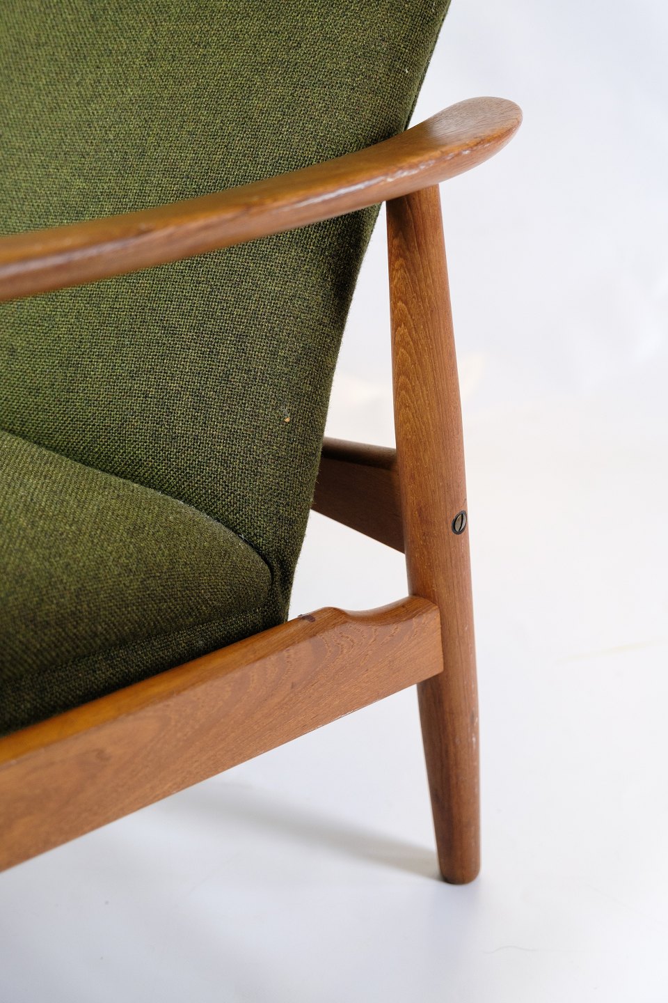 Alf Svensson, en anerkendt designer, har skabt disse lænestole med en elegant ramme i teaktræ, der harmonerer smukt med det grønne stofbetræk.
