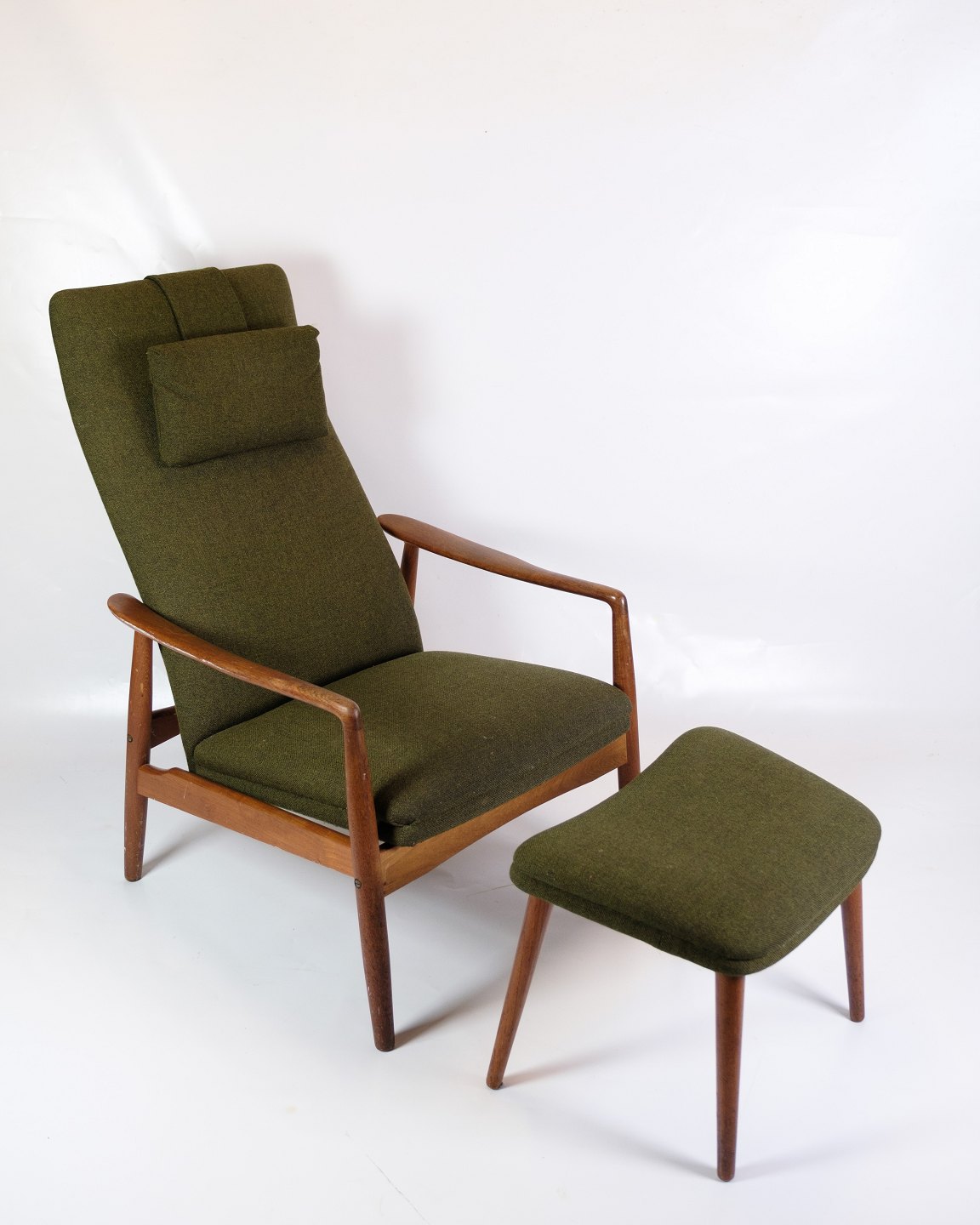 Sæt af 2 lænestole med skammel i teak og grønt stof, designet af Alf Svensson og produceret af Fritz Hansen i 1960'erne.