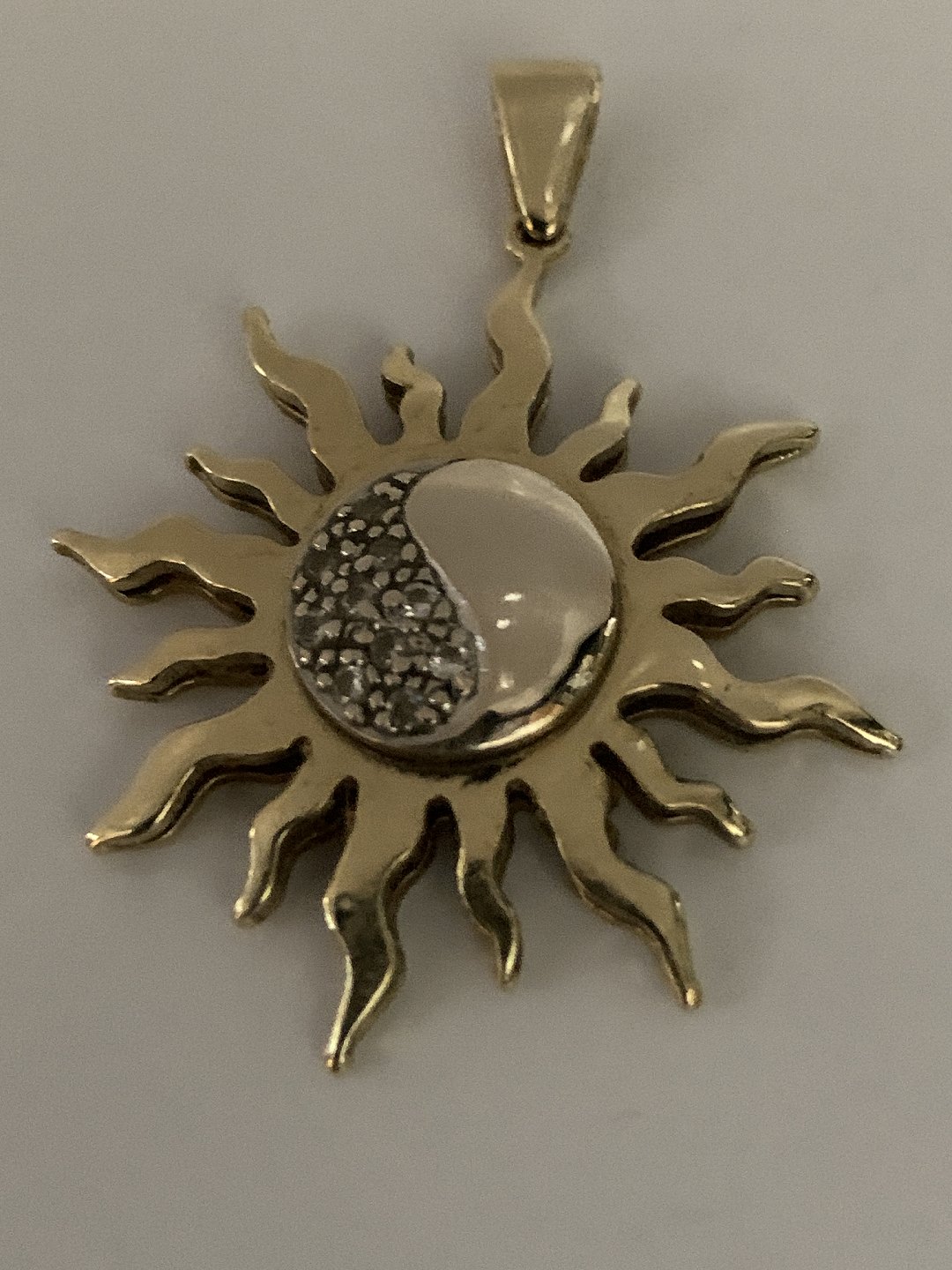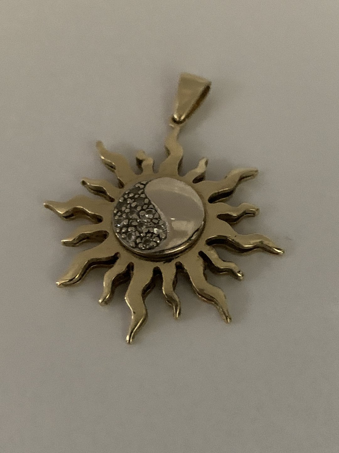 Pendant in 14 carat gold, sun with yin-yang and small white stones.