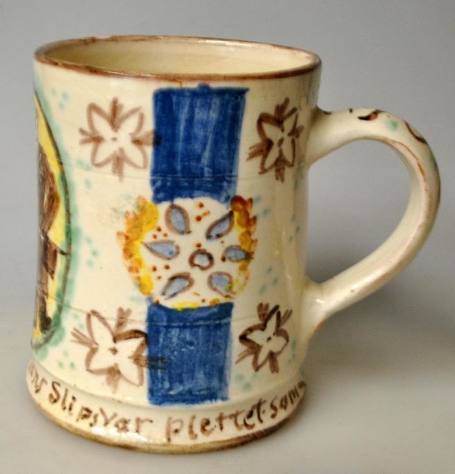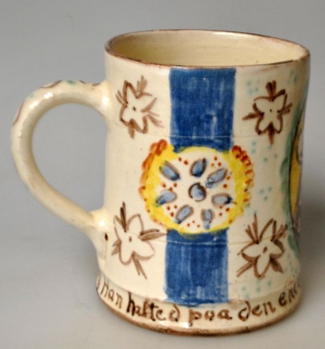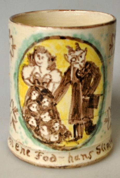Andersen-Høyer, Kay (20th century) / Anders Høy, Denmark: Mug. Hand painted earthenware. Painted decoration in the form of the Devil and woman. With the text: "He limped on one foot - his tie was stained like ---". Signed: Anders Høy 1936. H.: 11.8 cm.