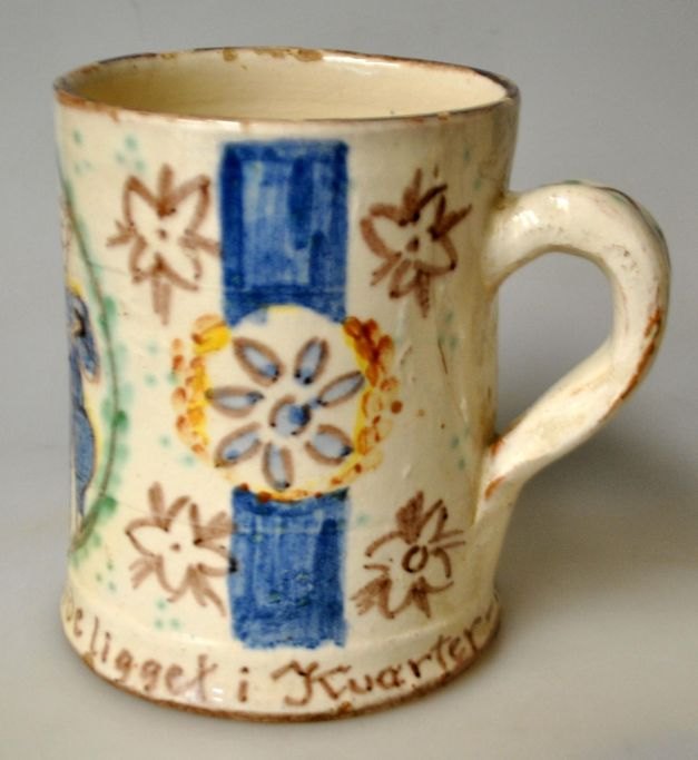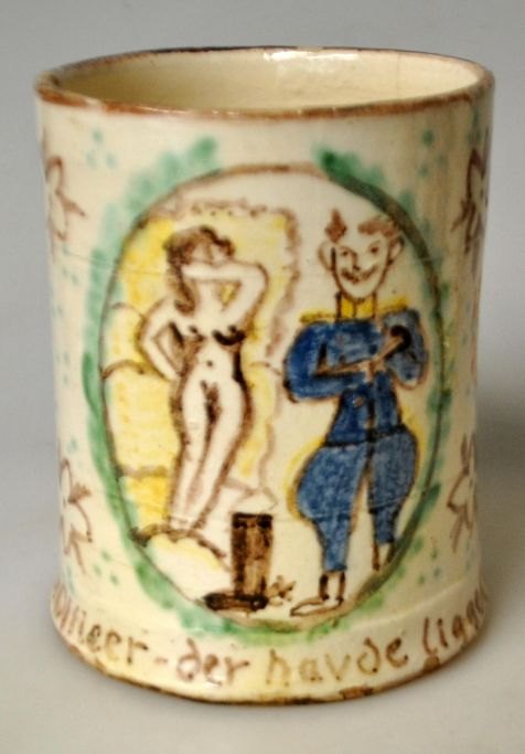 Andersen-Høyer, Kay (20th century) / Anders Høy, Denmark: Mug. Polychrome painted earthenware. Hand-painted decoration in the form of an officer and a naked woman. With the text: "They talked about an officer - who had been lying in Kvarter". Signed: Anders Høy 1936. H.: 11.8 cm.