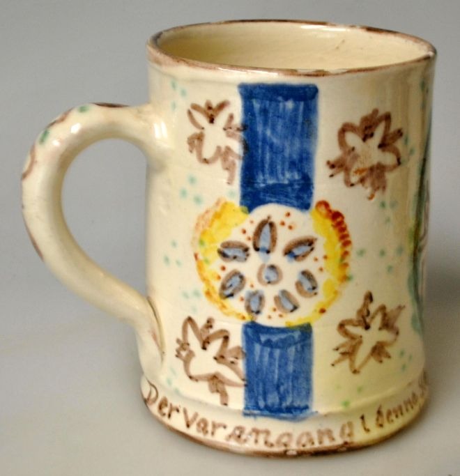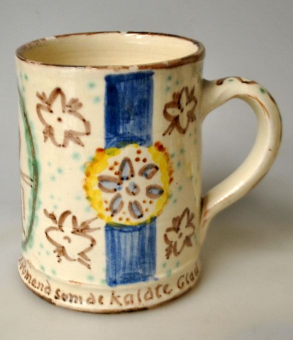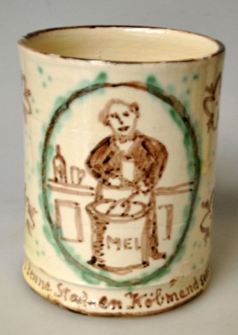 Andersen-Høyer, Kay (20th century) / Anders Høy, Denmark: Mug. Polychrome painted earthenware. Hand-painted decoration in the form of a grocery store. With the text: "Once upon a time there was in this city - a merchant they called Glad". Signed: Anders Høy 1936. H.: 11.8 cm.