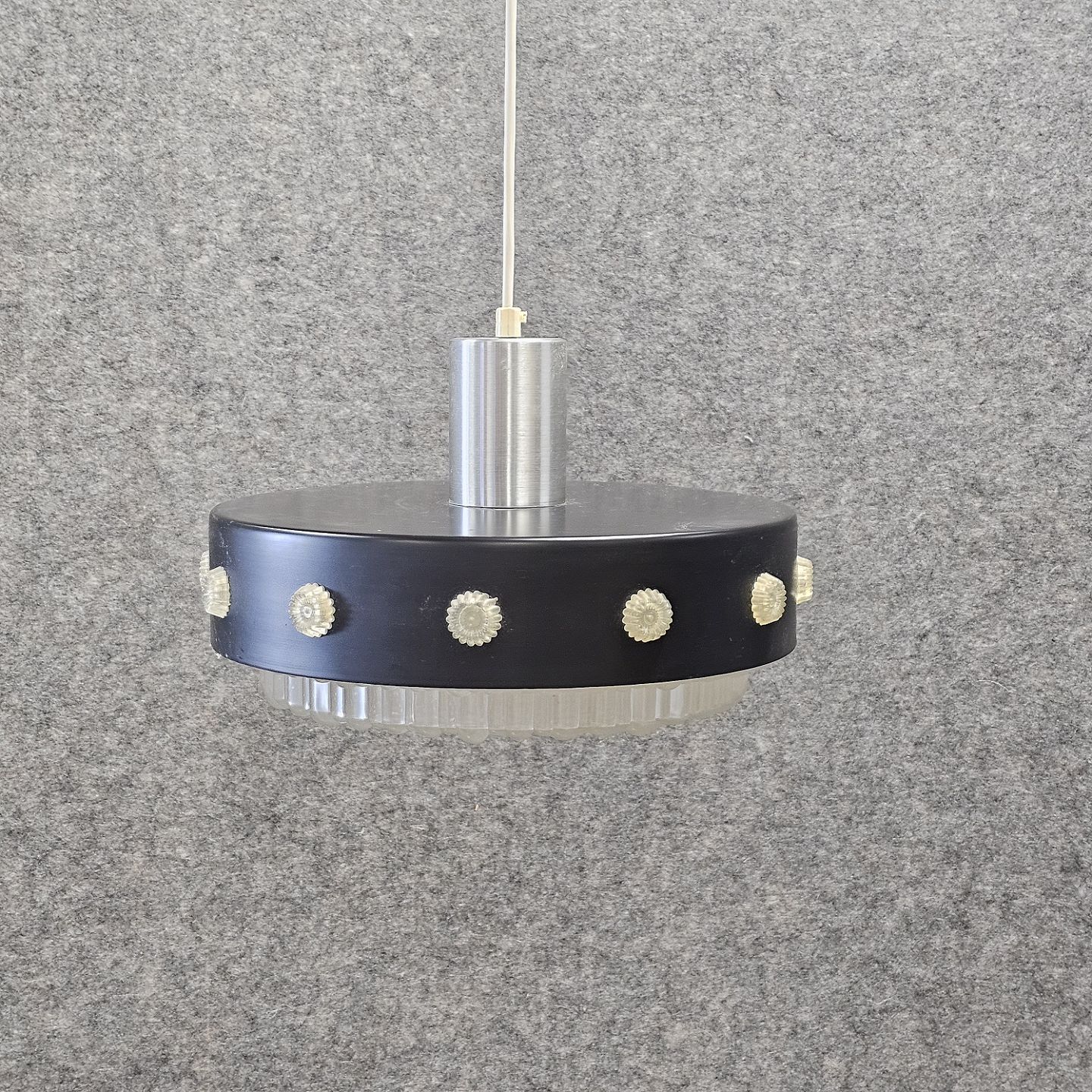 Pendel af frostet plast og sort metal, dekoreret med små blomster i plast