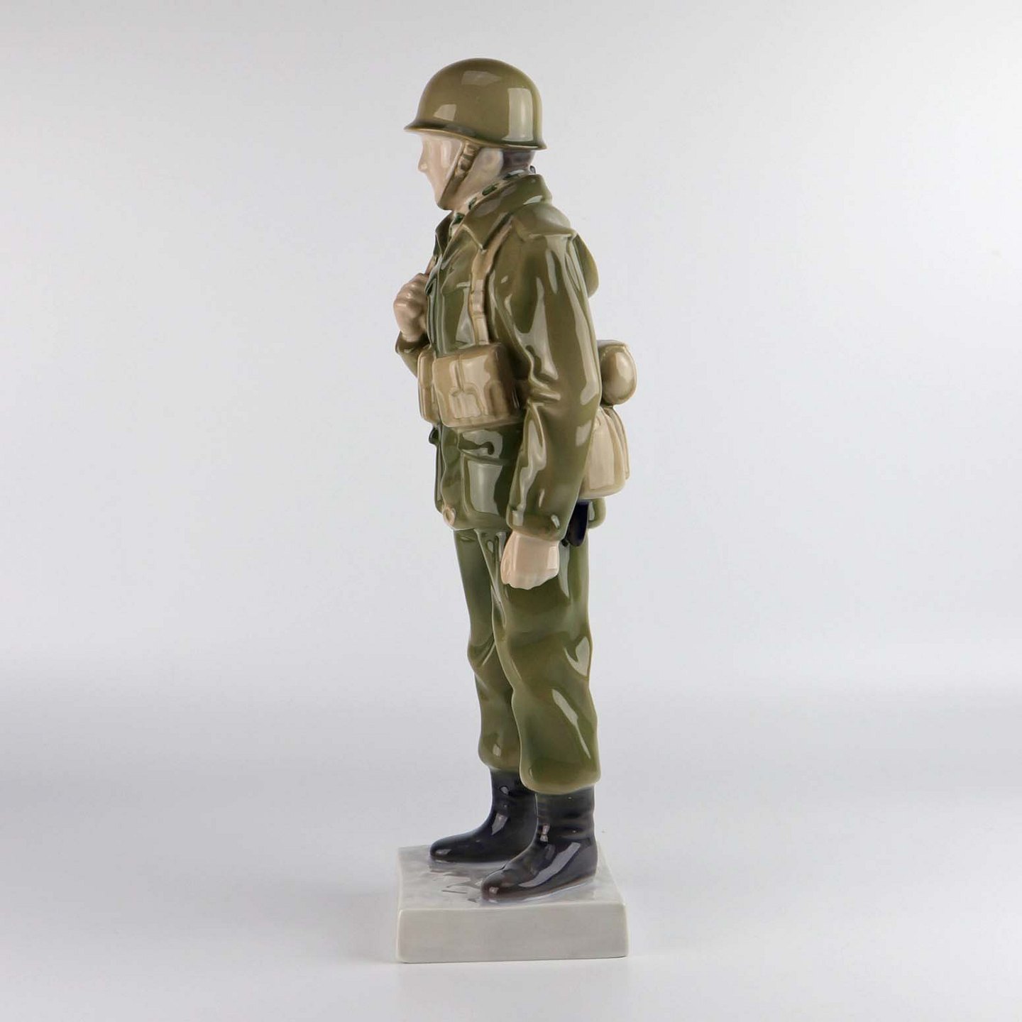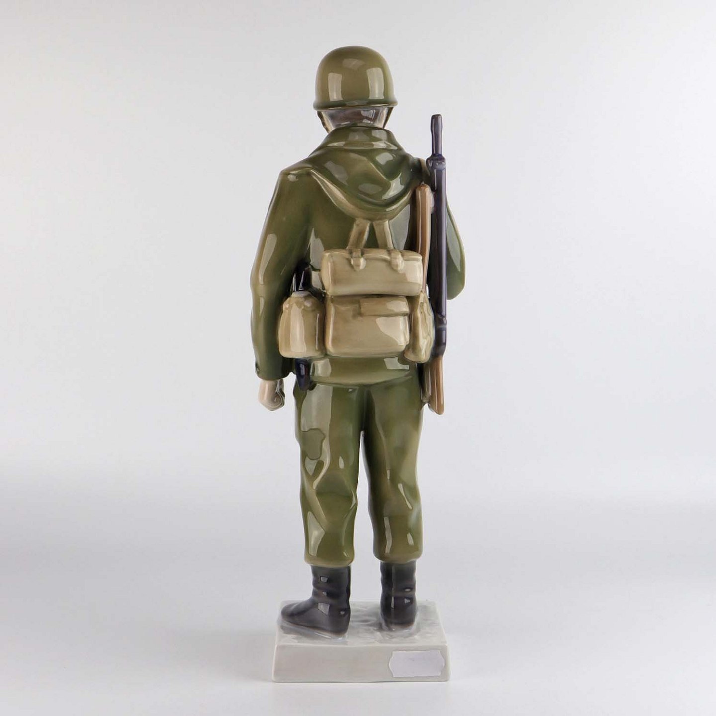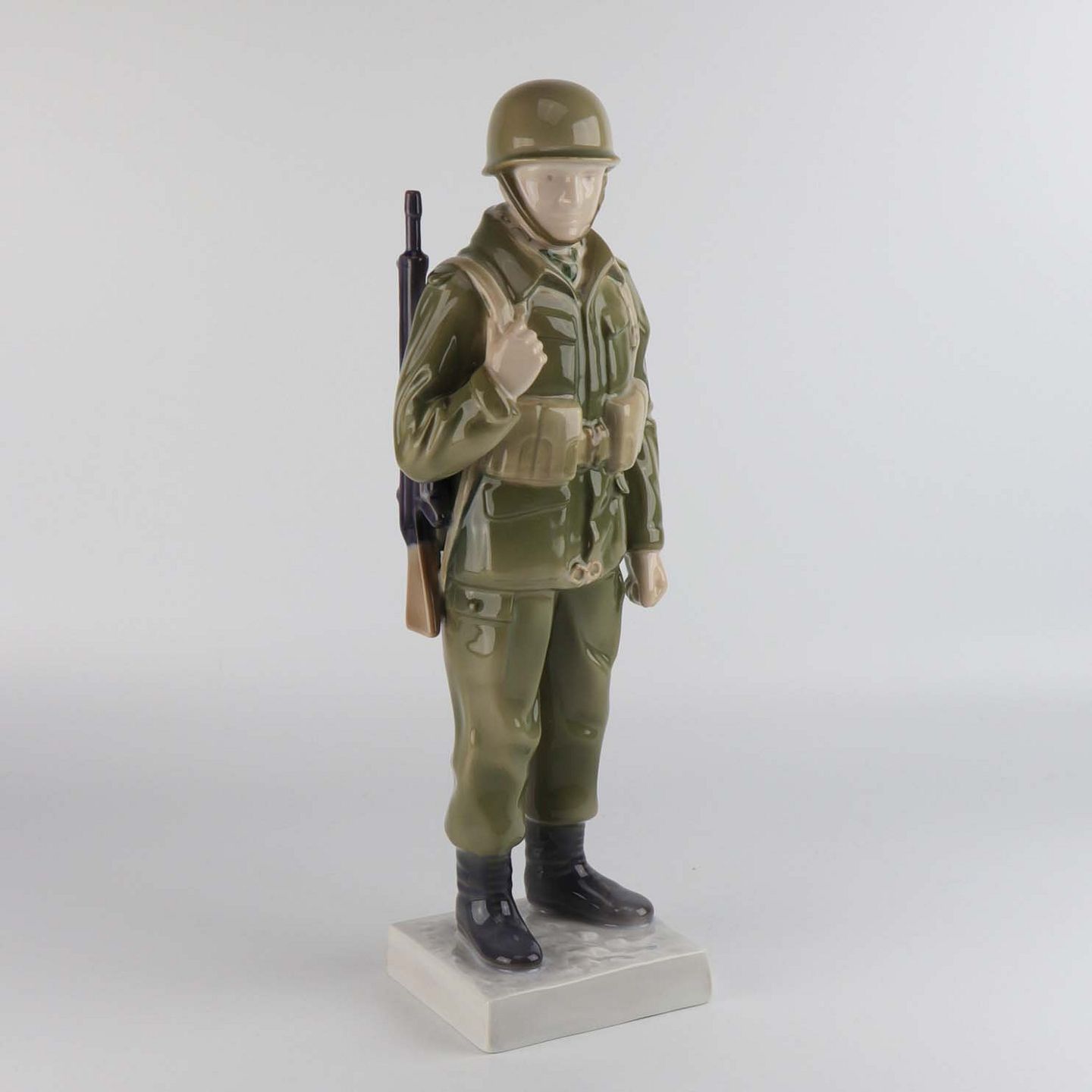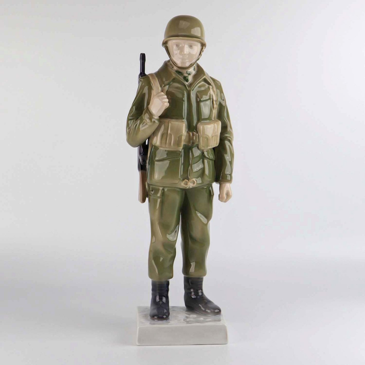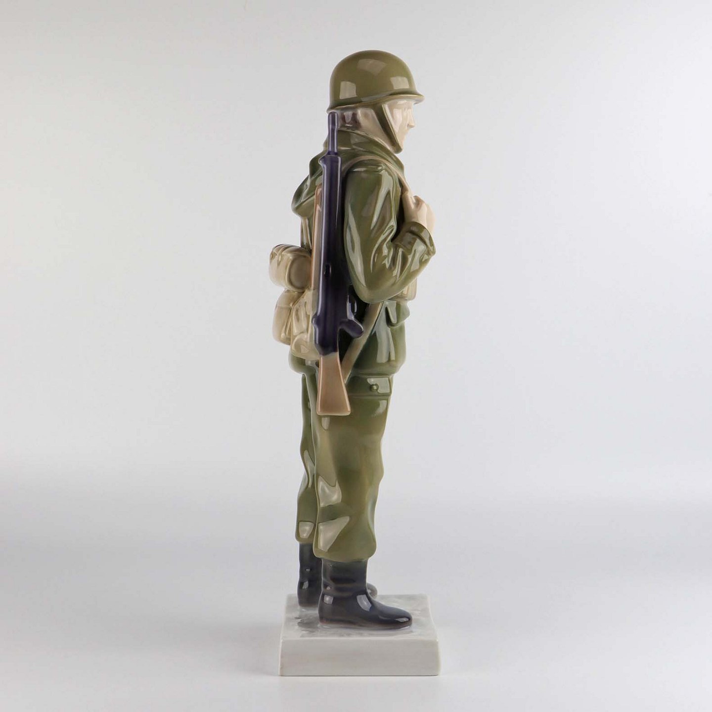 Figur i porcelæn nr. 2444 med motiv af en soldat i kampuniform med gevær og fuld udrustning.