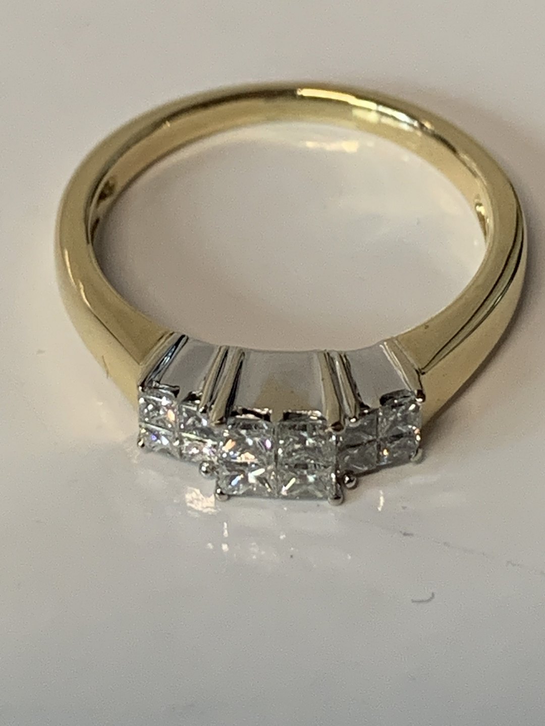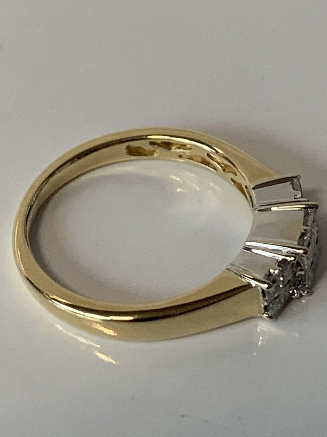 Flot guldring med diamanter på toppen af ringen. Selve huset er lavet af hvidguld, mens ringen er af rødguld. I huset er indlagt flotte store diamanter. Kombinationen af de to typer guld, giver ringen dynamik og liv. Samtidig er diamanterne med til at give ringen klasse. En flot ring, der kan bruges af kvinder i alle aldre.