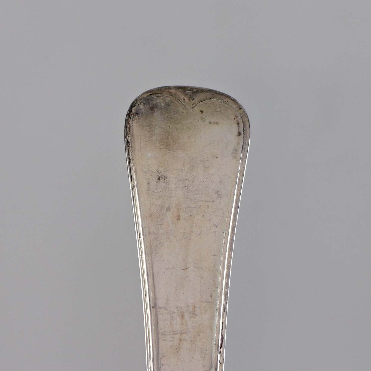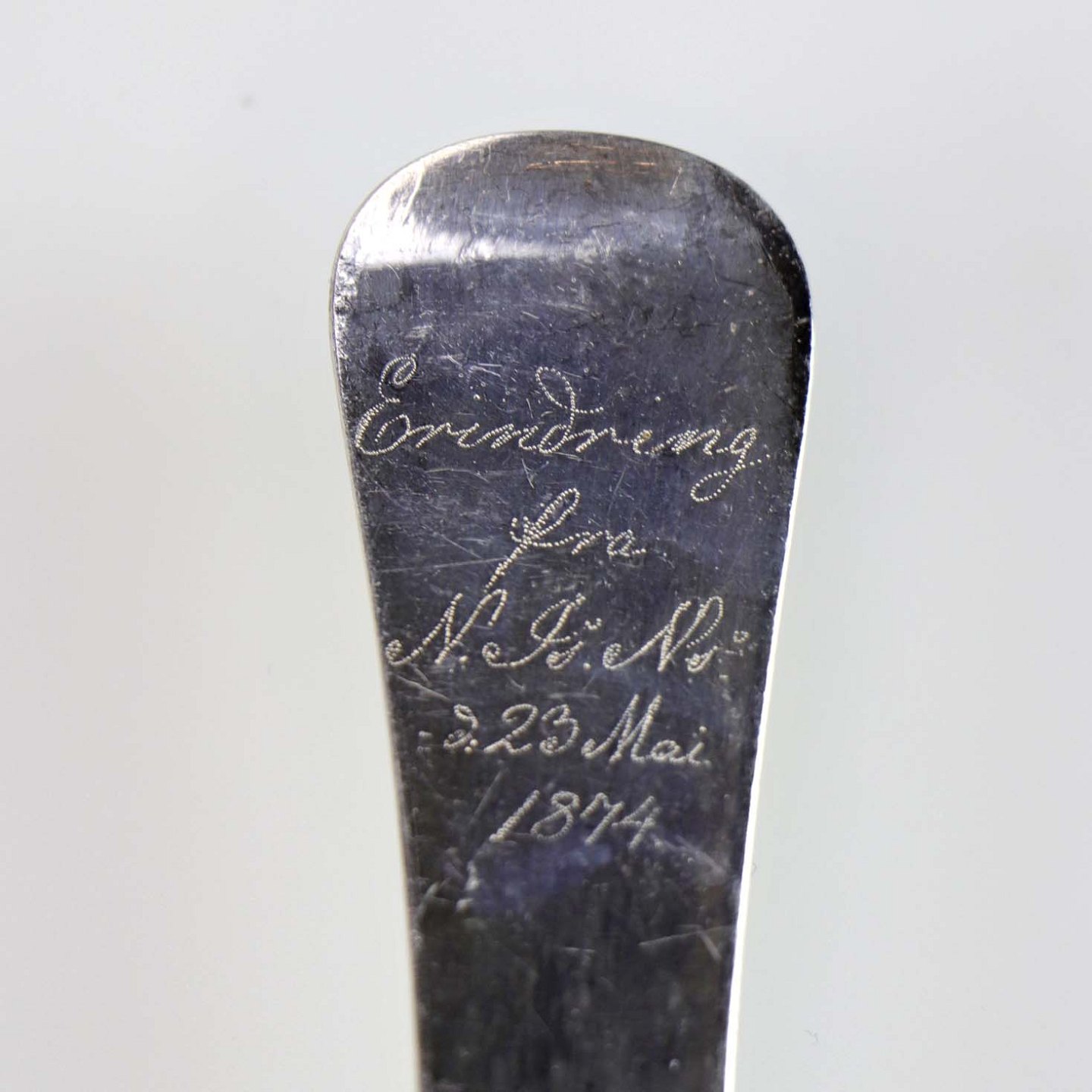 Antik riflet spiseske i sølv fra 1800 tallet med teksten Erindring fra N.J.N d. 23 maj 1874