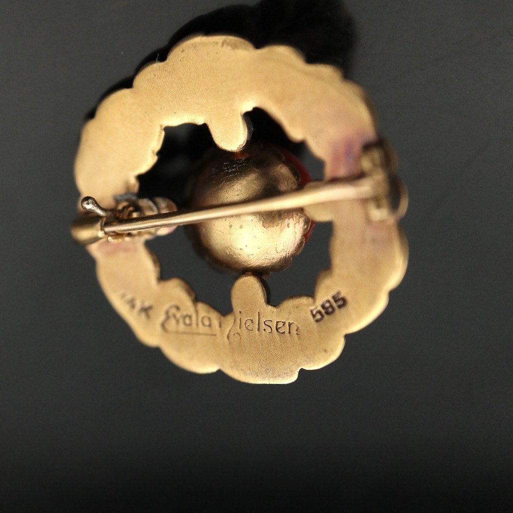 Evald Nielsen. Skønvirke Broche i 14k guld med koral.