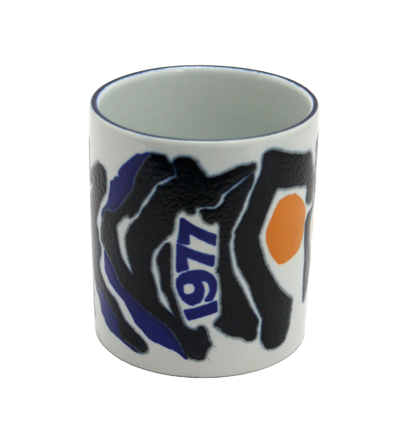 Text available in Danish: Royal Copenhagen, Lille årskrus 1977. Designer Inge Lise Kofoed. Nr. 3495. Årskrus er produceret fra 1967 til 2014. Højde 7,5 cm. Diameter 6,5 cm. Pris: 125 kr. stk. Lager: 3