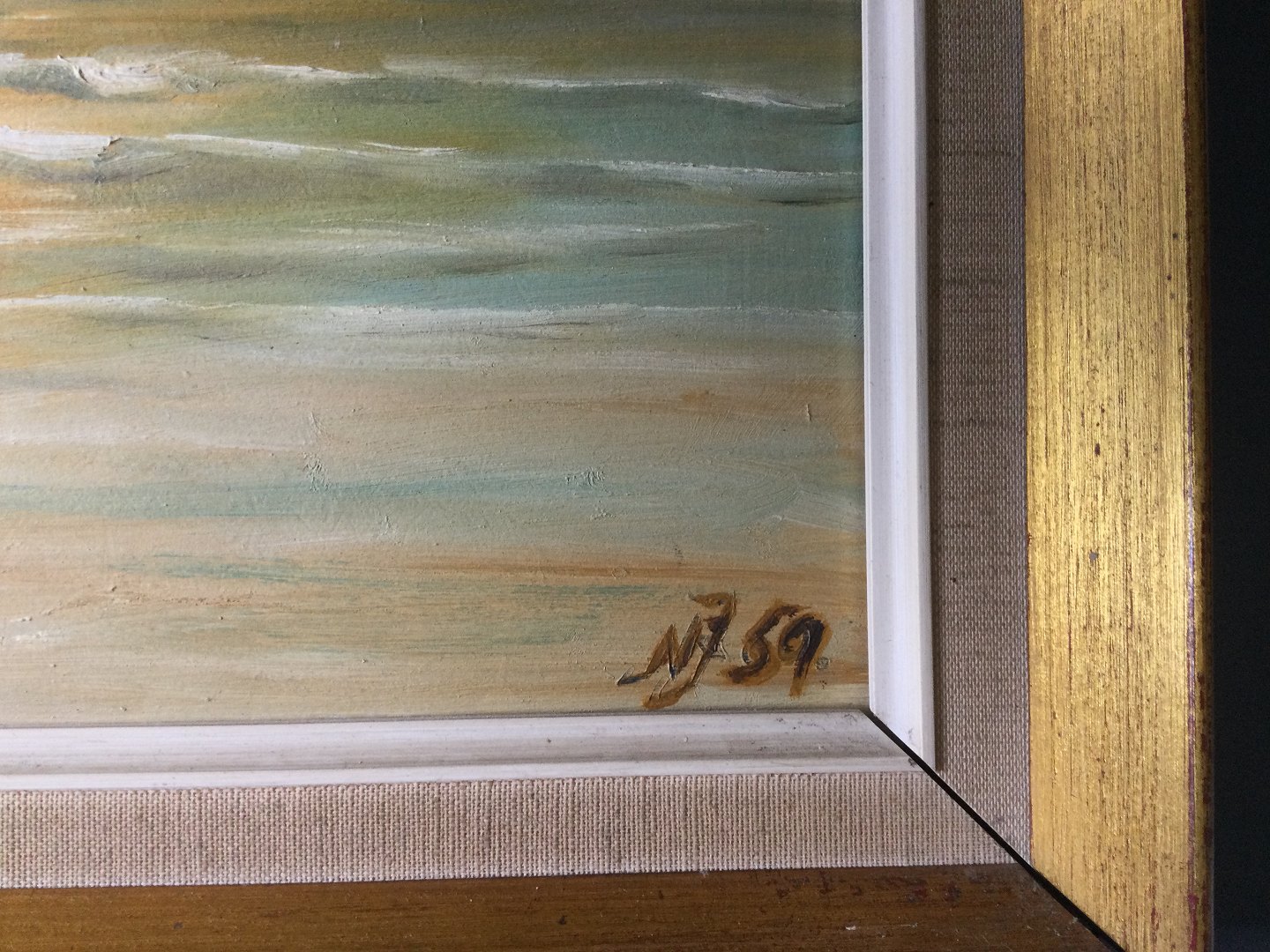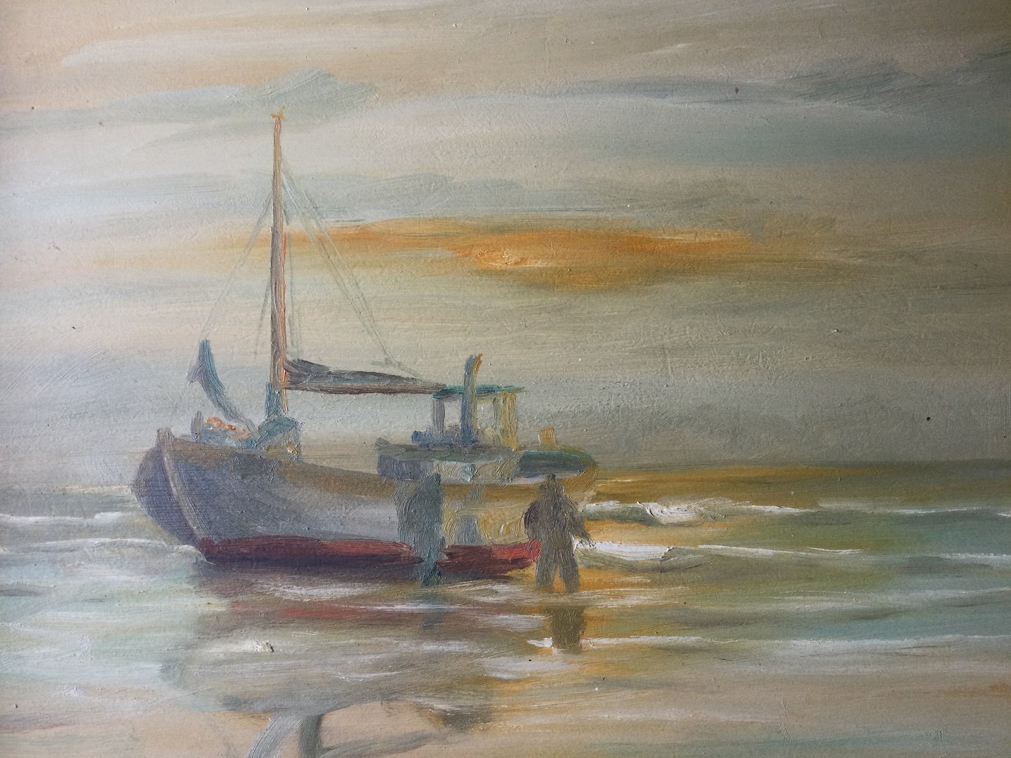 Maleri af Niels Jensen 1959 - Fiskekutter ved Standen, Blokhus.