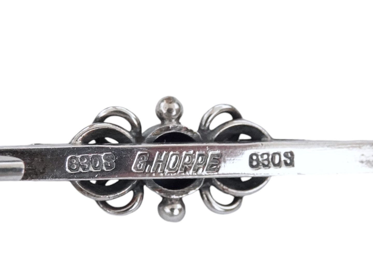 Stemplet "G. Hoppe 830S". Gottfred Henry Hoppe var sølvsmed i Slagelse fra 1943 til 1964.