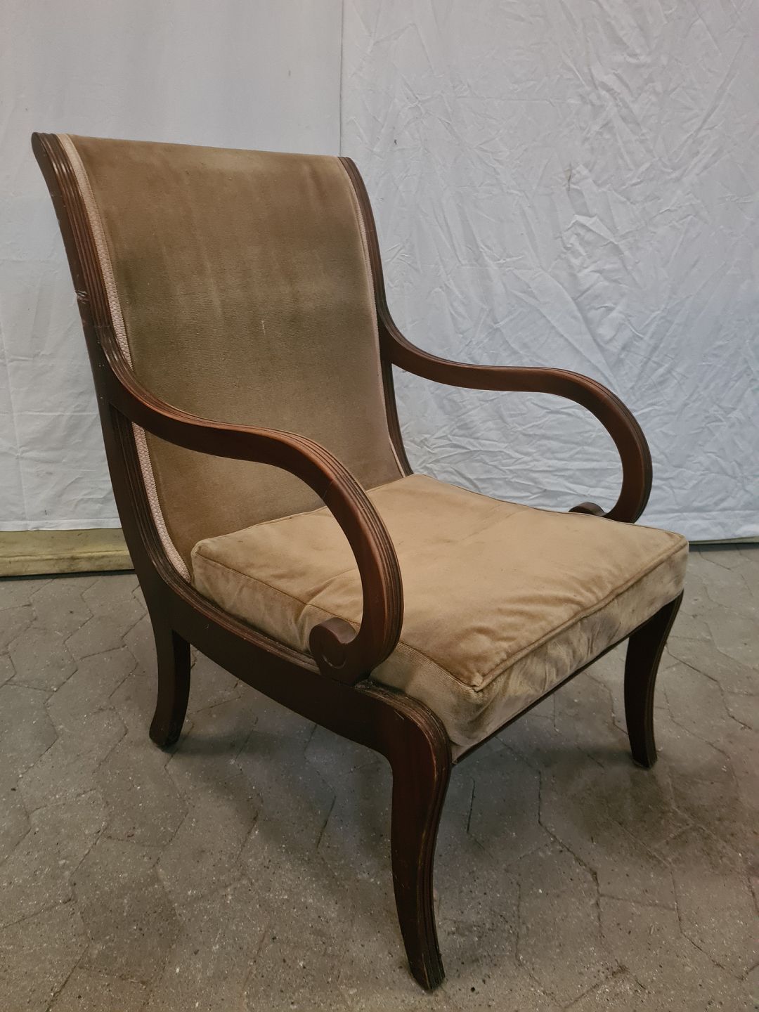 Lænestol i mahogni med velourbetræk, fra 1980erne.