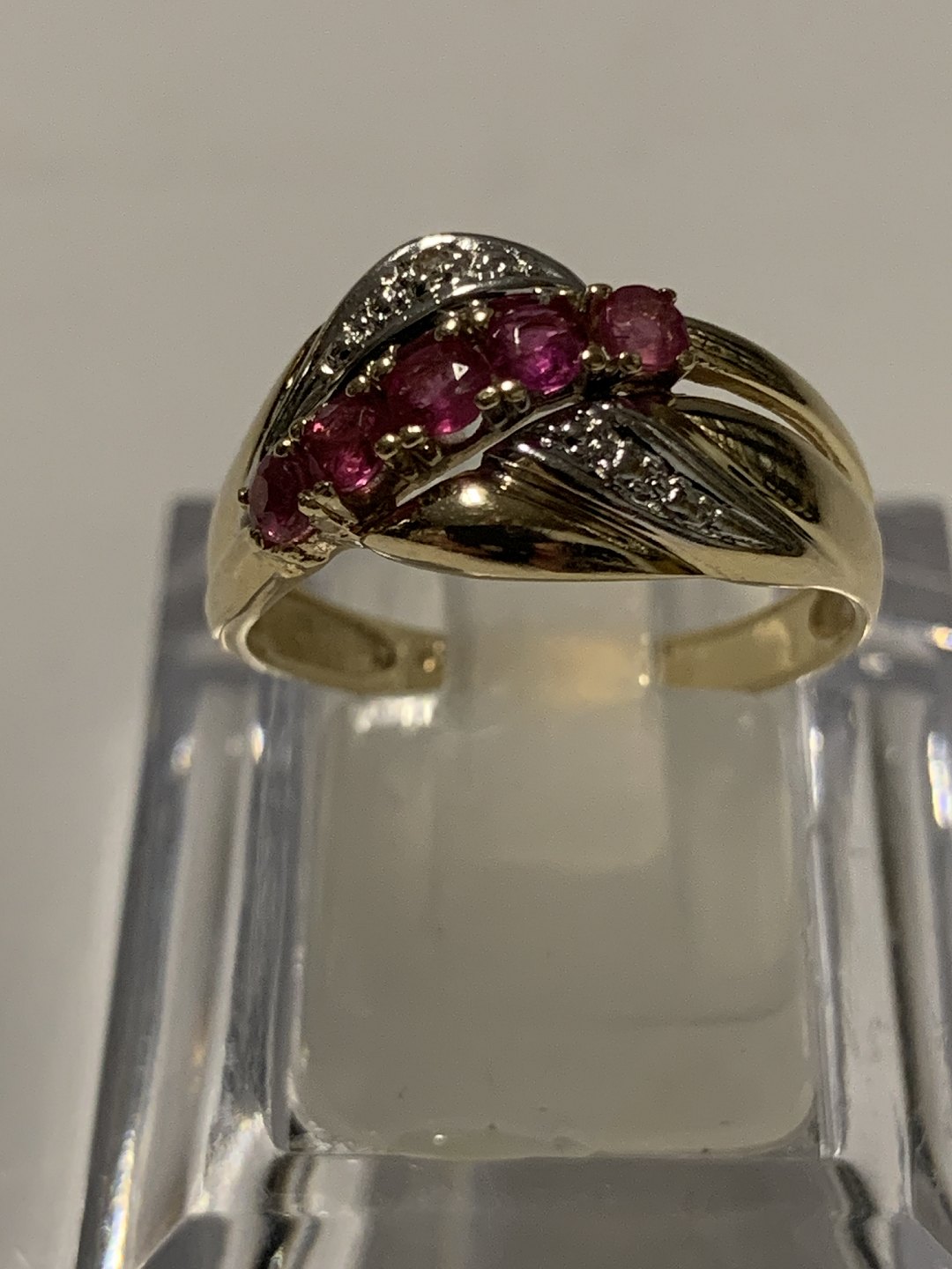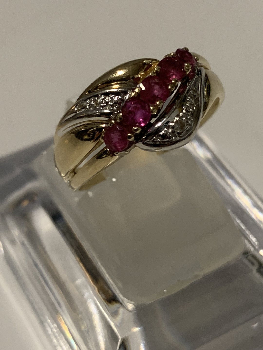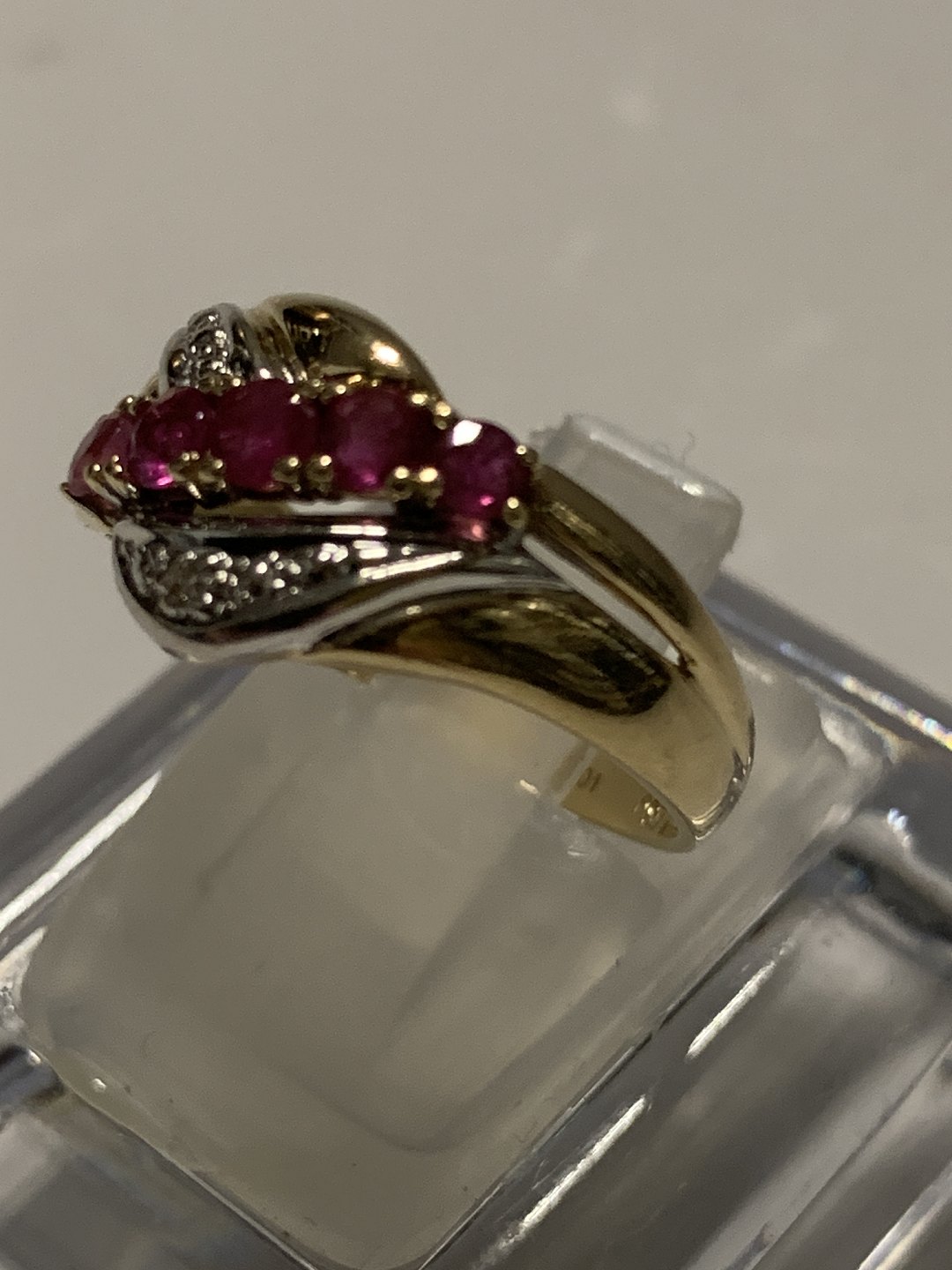 Flot Damering, med fem røde rubiner samt indlagte diamanter, i 14 karat guld.