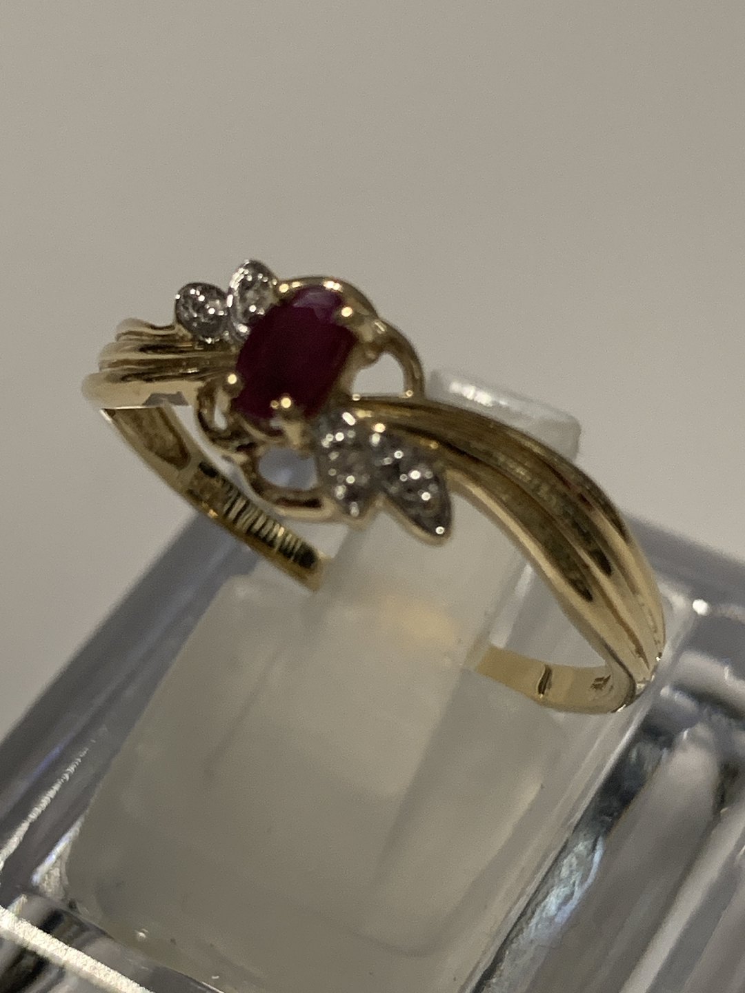 Flot Damering, med en rød rubin samt indlagte diamanter, i 14 karat guld.