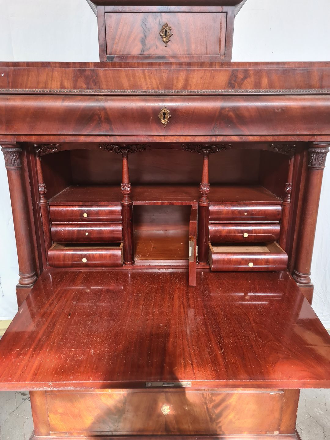 Gammel sekretær i fineret mahogni, fra 1890erne.