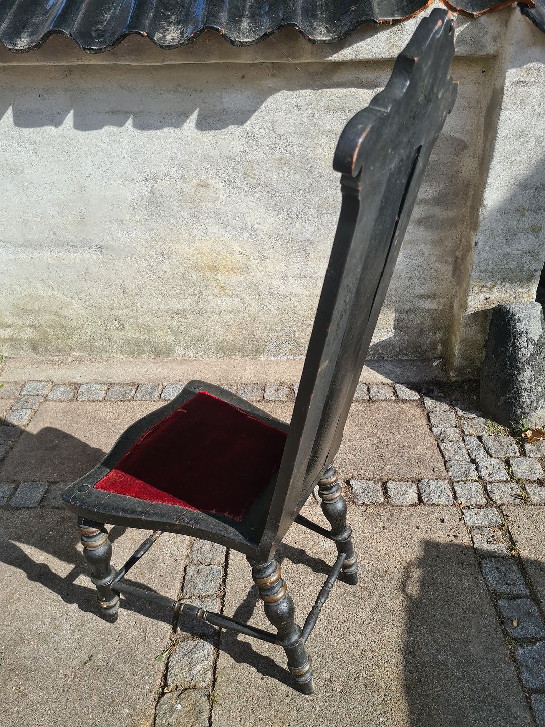 Højrygget stol fra starten af 1900 tallet. Sortmalet og betrukket med rød velour. Fremstår pæn og udmærket stabil med lettere slid på velour og udsatte kanter,