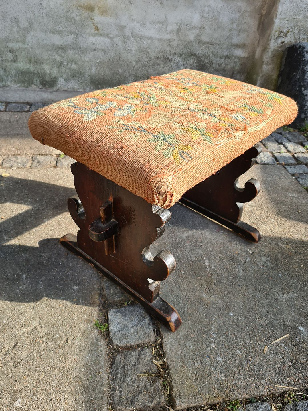 Taburet fra 1930'erne i eg og med broderet sæde. Broderiet er slidt på udsatte hjørner. Selve taburetten fremstår udmærket stabil.