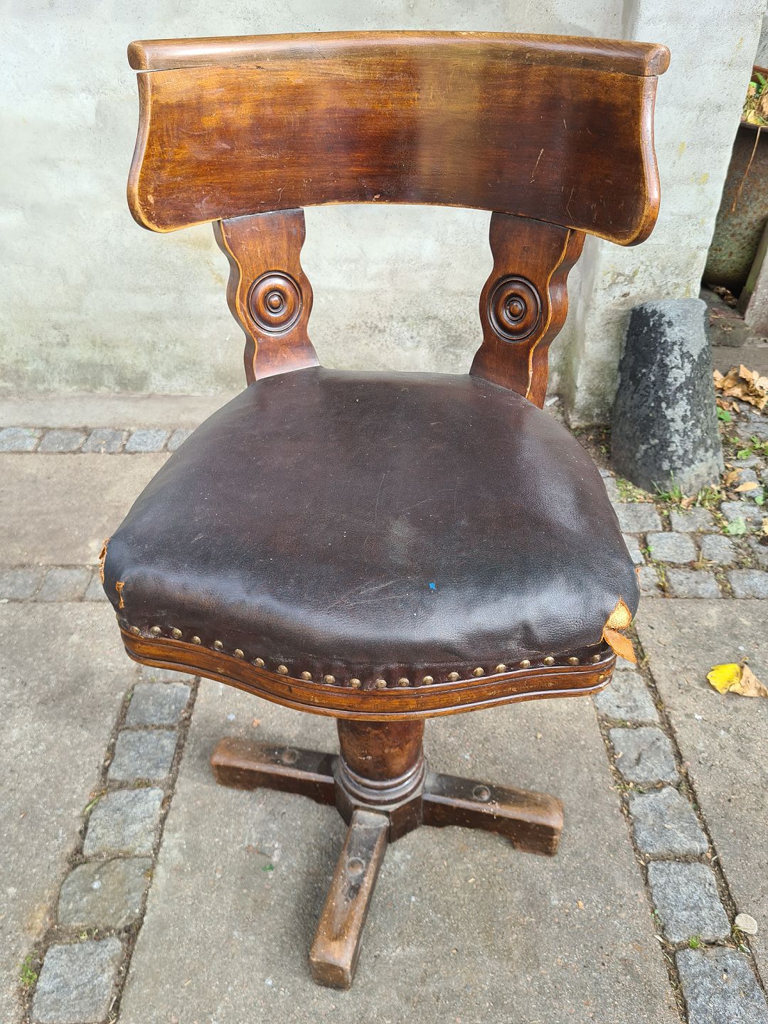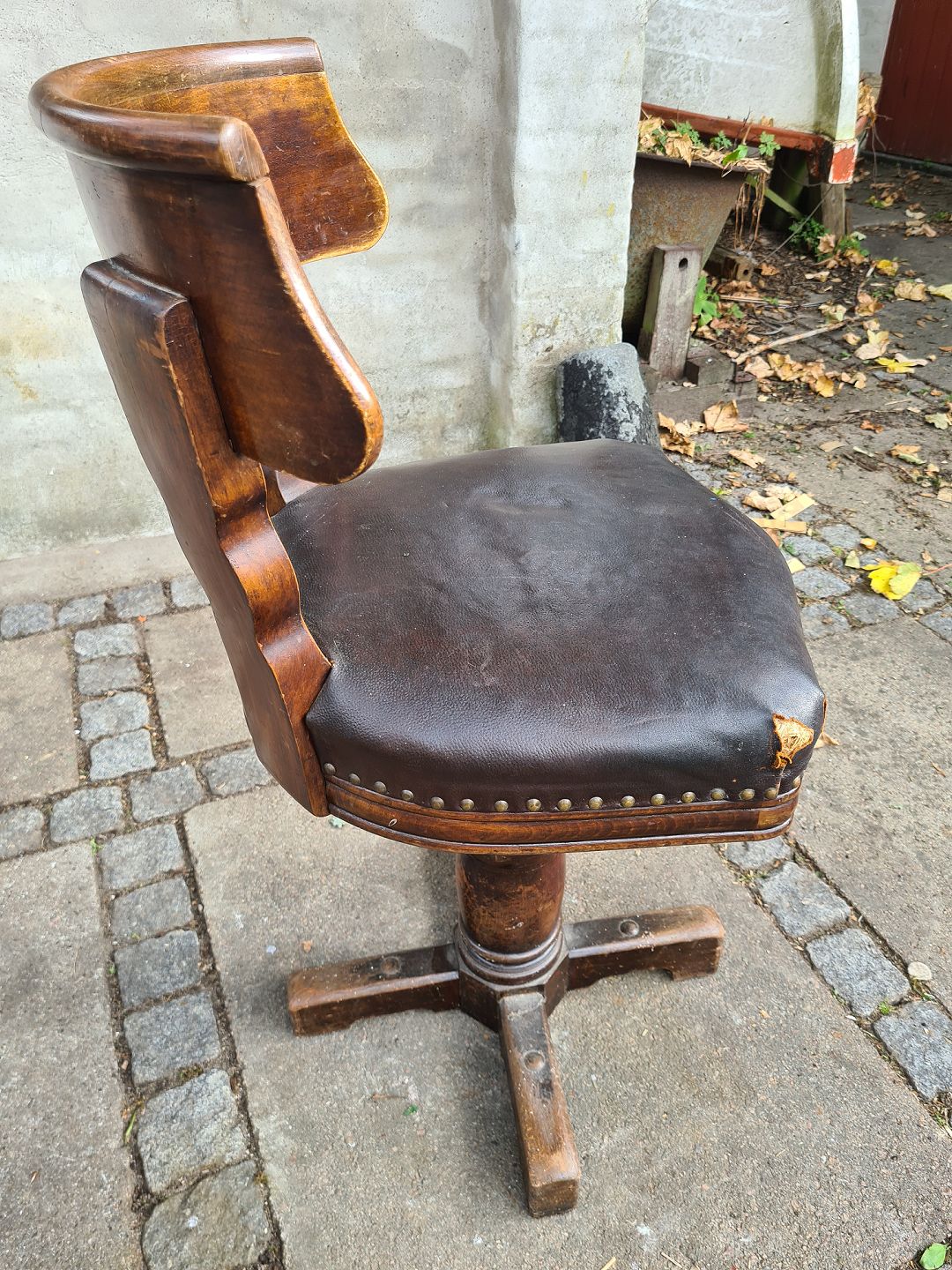 Gammel kontorstol fra 1930'erne I eg, på drejefod og med lædersæde. Fremstår pæn og stabil dog med læderskader på hjørnerne af sædet. (billede)