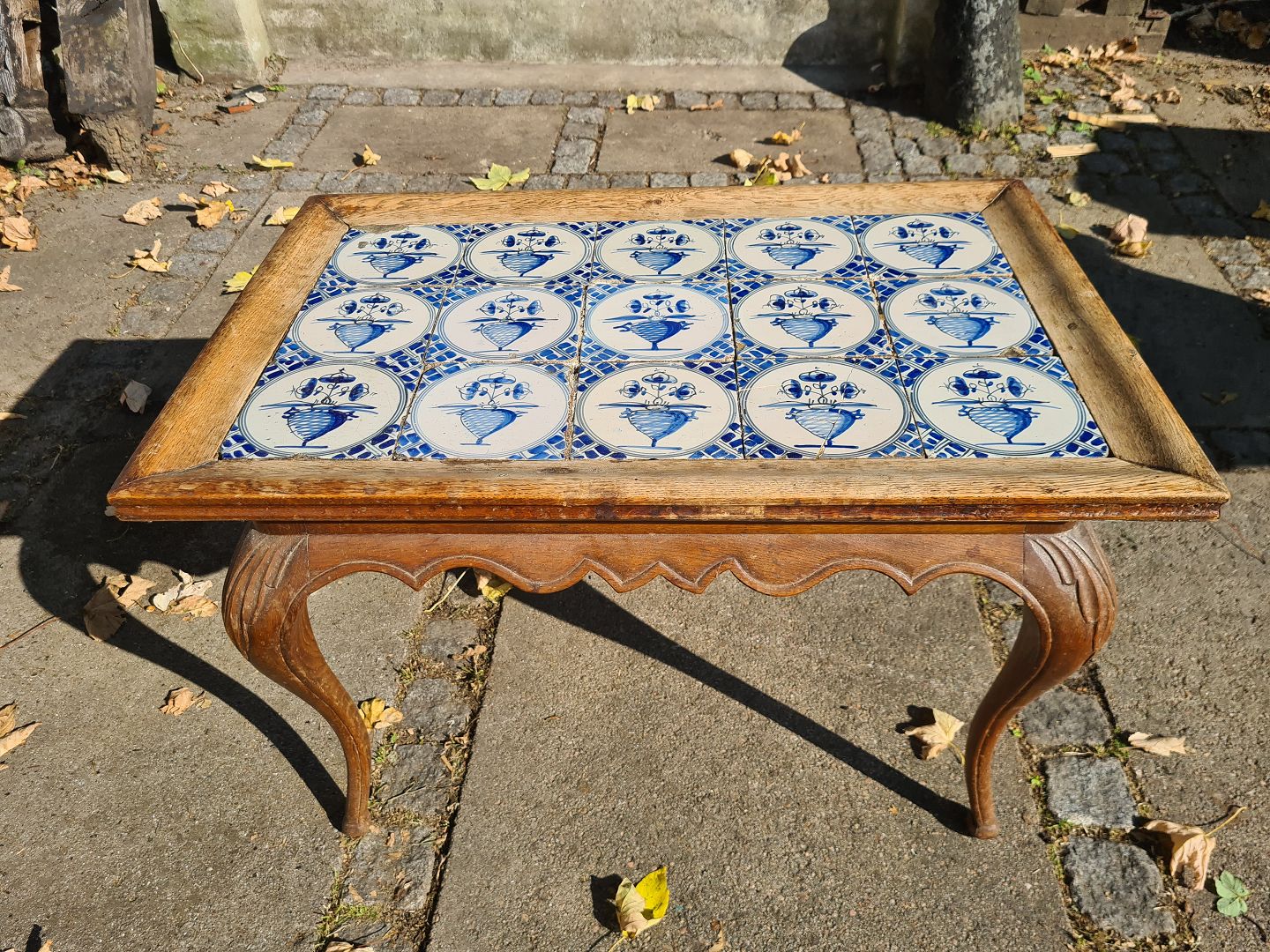 Sofabord fra starten af 1900 tallet i eg og med ældre kakler. Fremstår pænt og udmærket stabilt. Dog med enkelte løse og revnede kakler. (Billede)