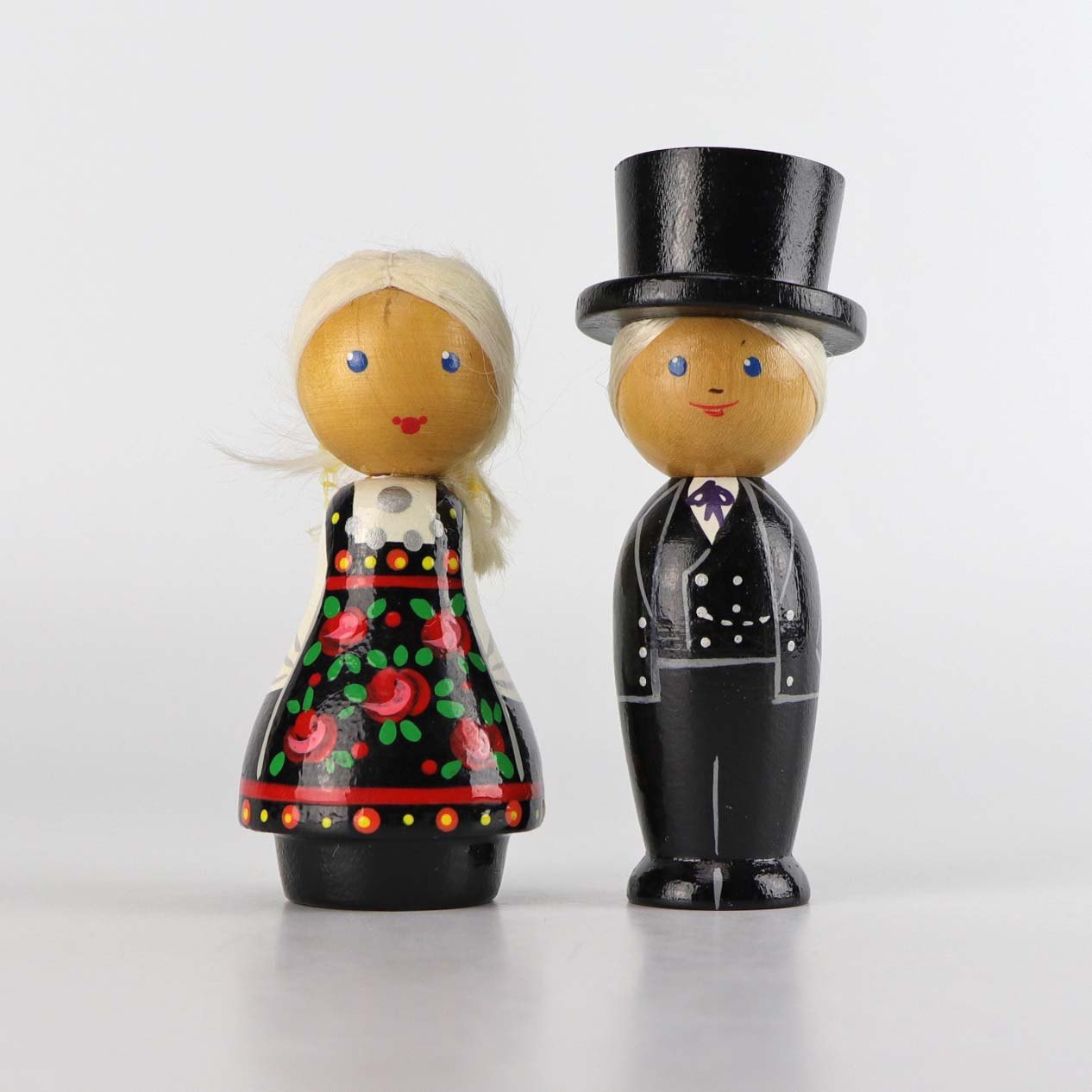 Et sæt med to figurer i malet træ med motiv af mand og kvinde i egnsdragter