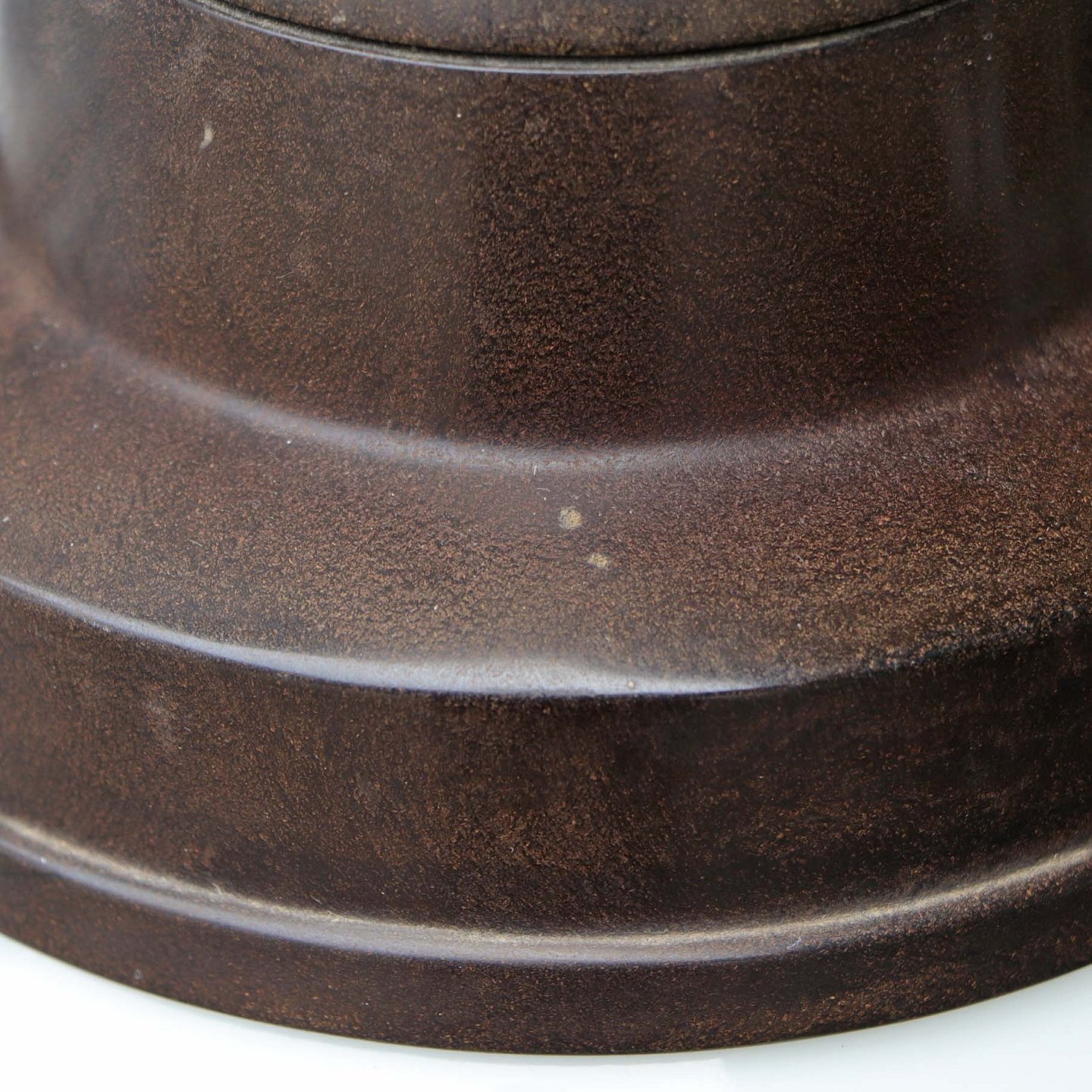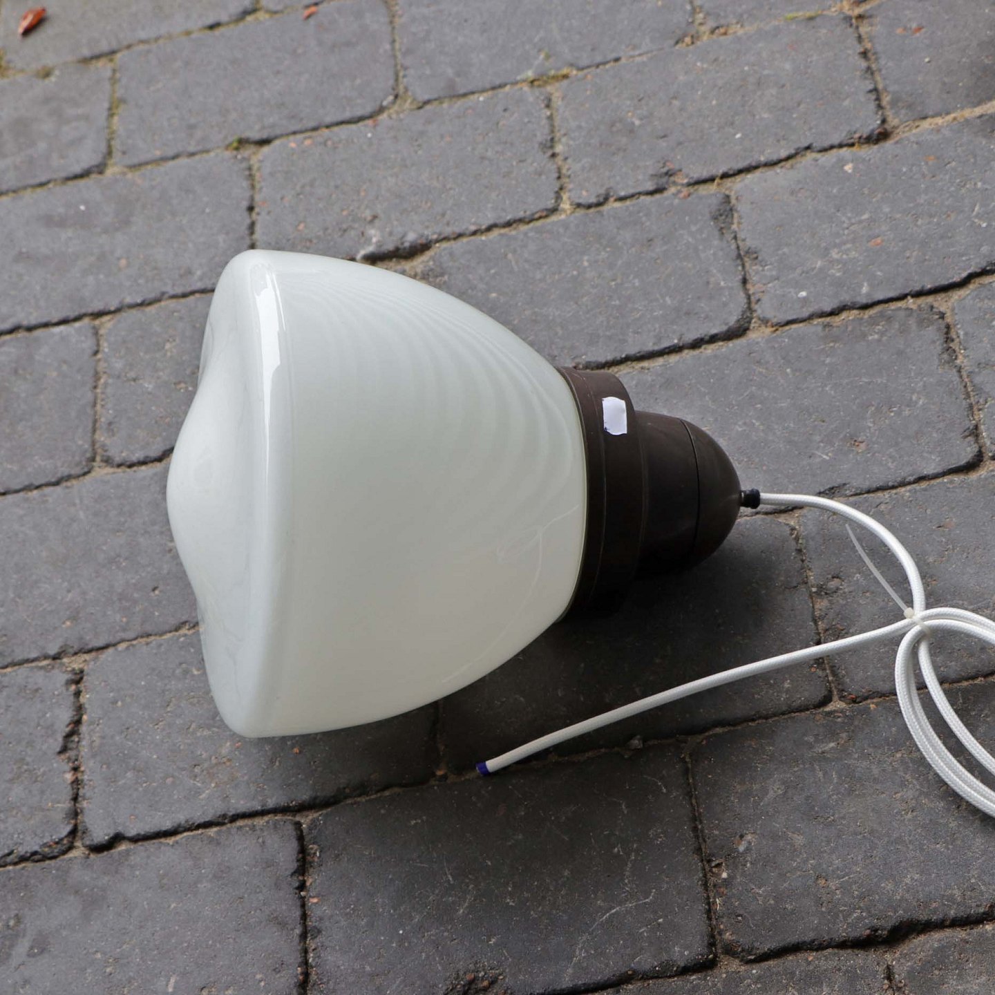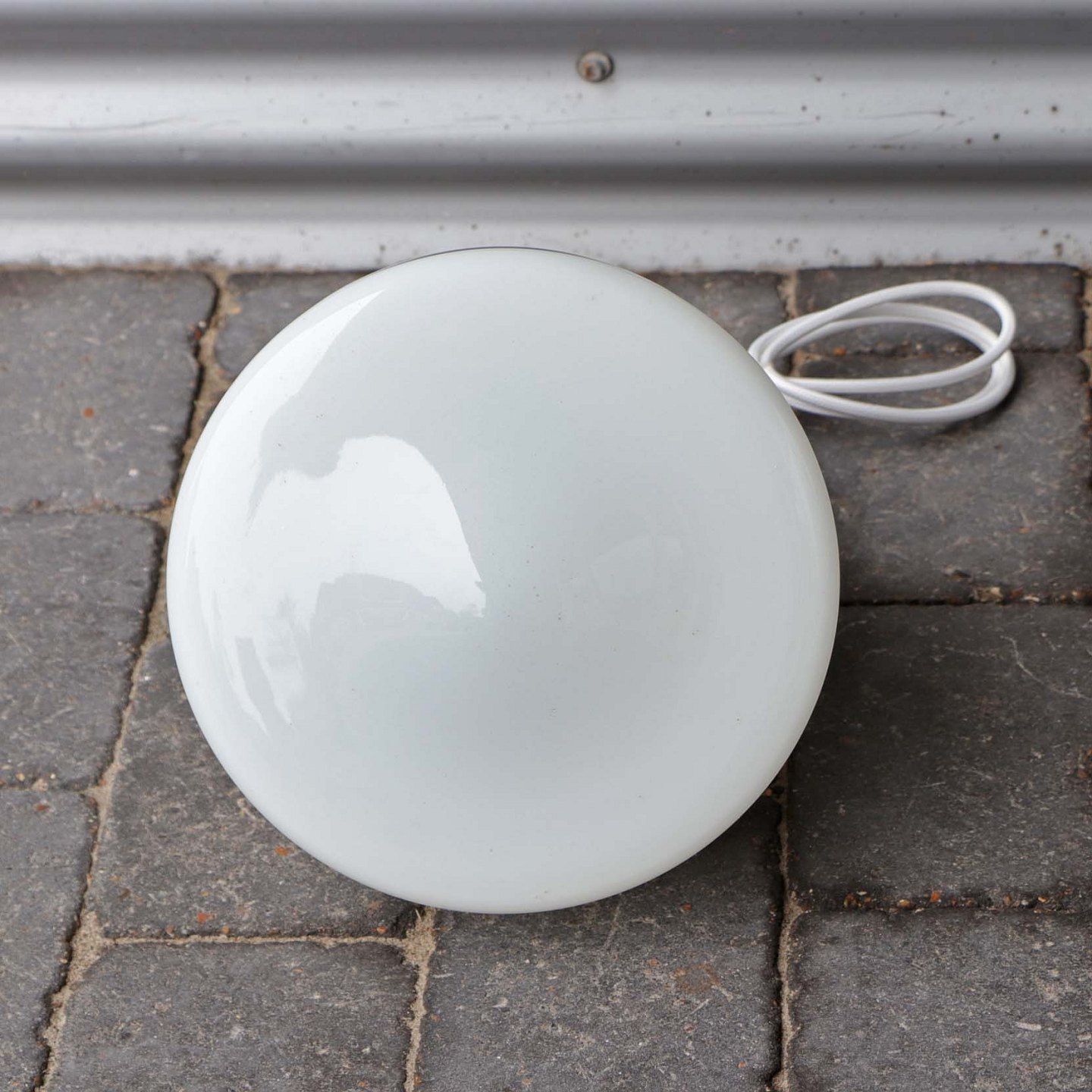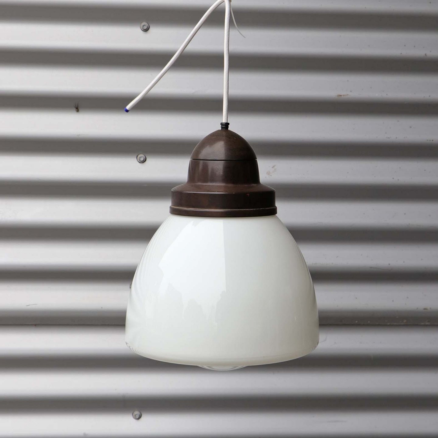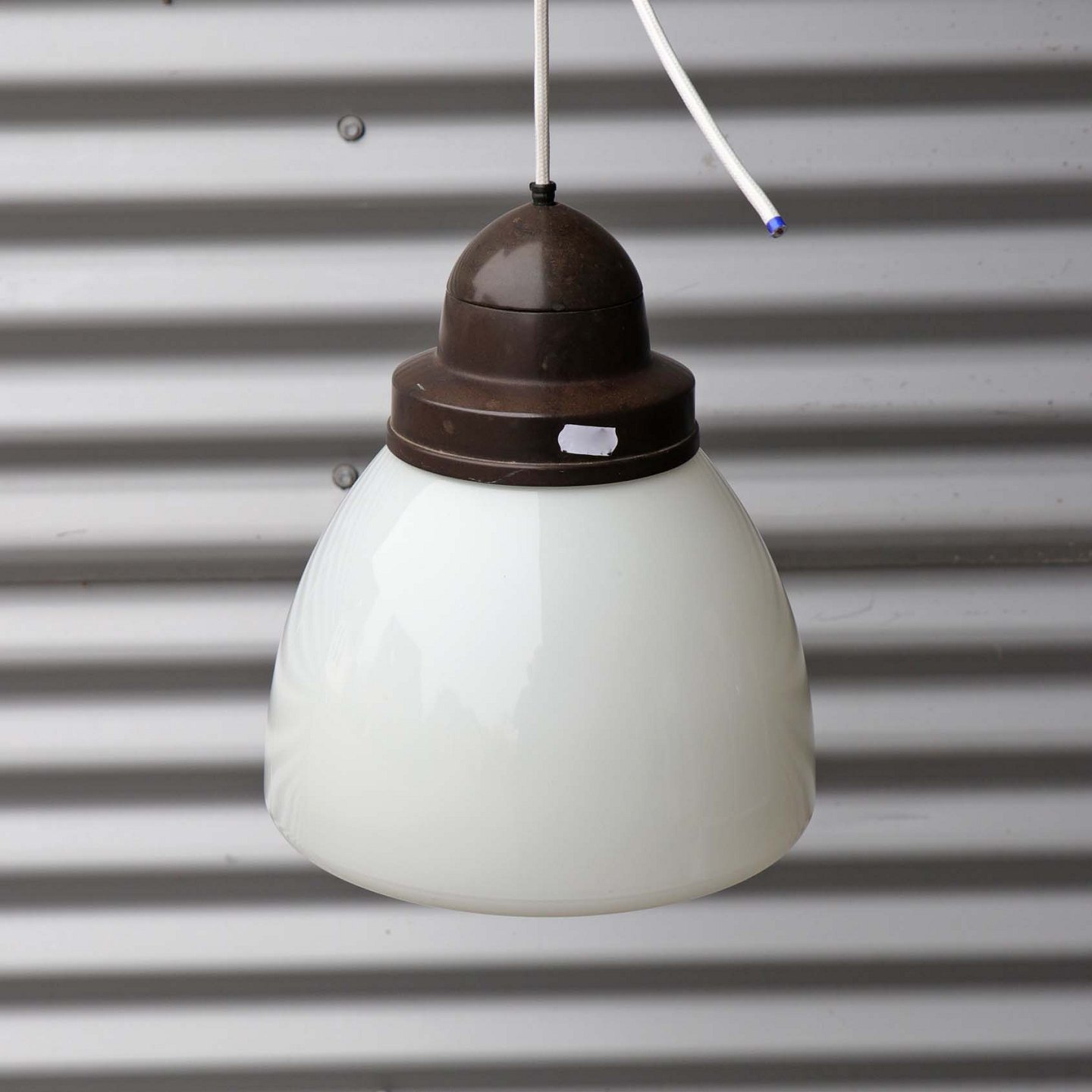 Ældre loftslampe med opal hvid lukket glasskærm monteret på mørkebrunt metal