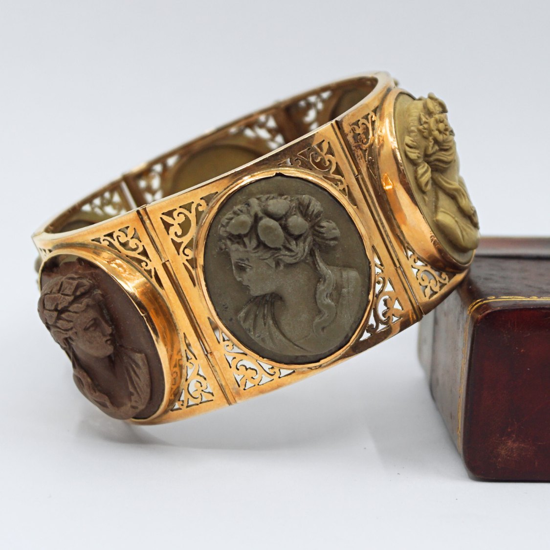 Bredt antikt Grand Tour armbånd i 14 kt. guld prydet med klassiske ansigter skåret i lavasten. Monteret med kasselås.