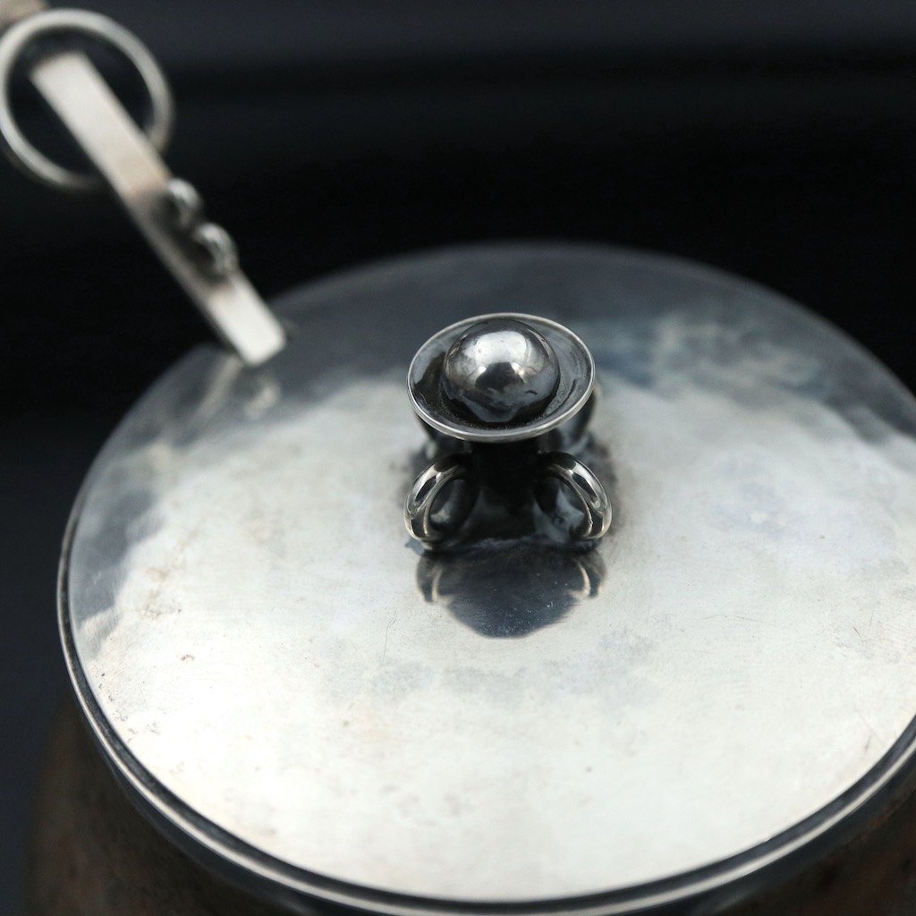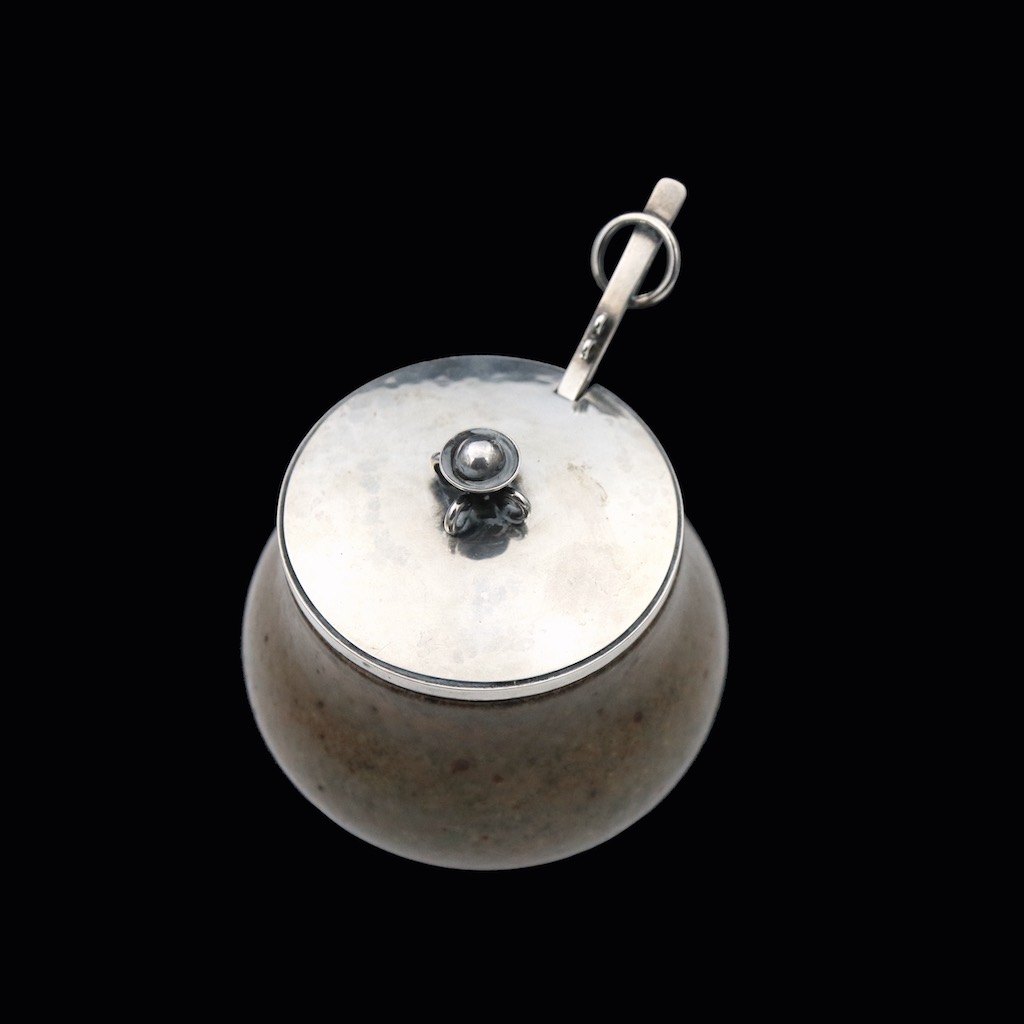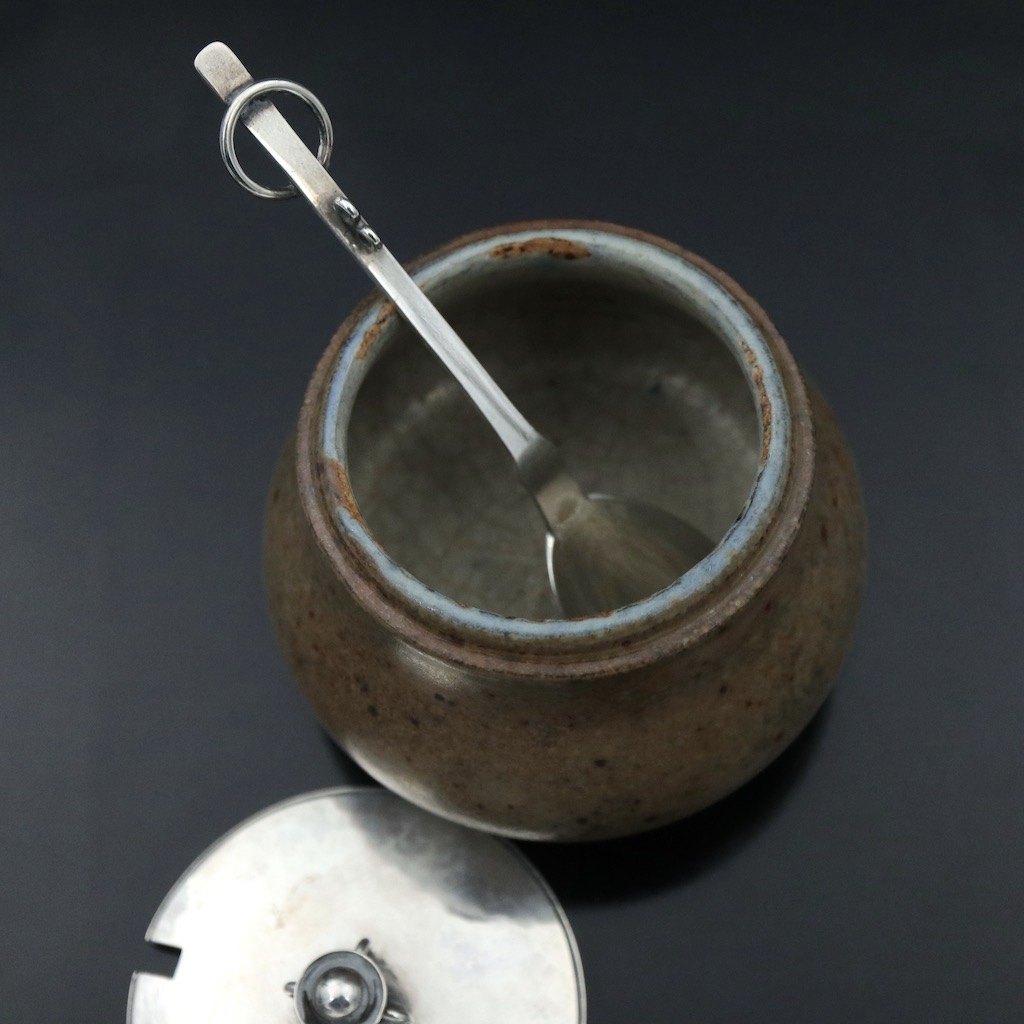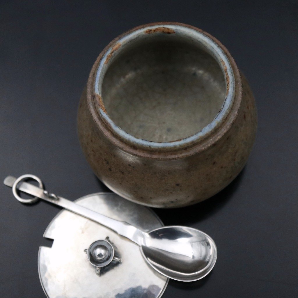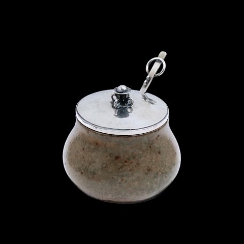 Hans Hansen. Krukke i stentøj med låg og ske i sterlingsølv.