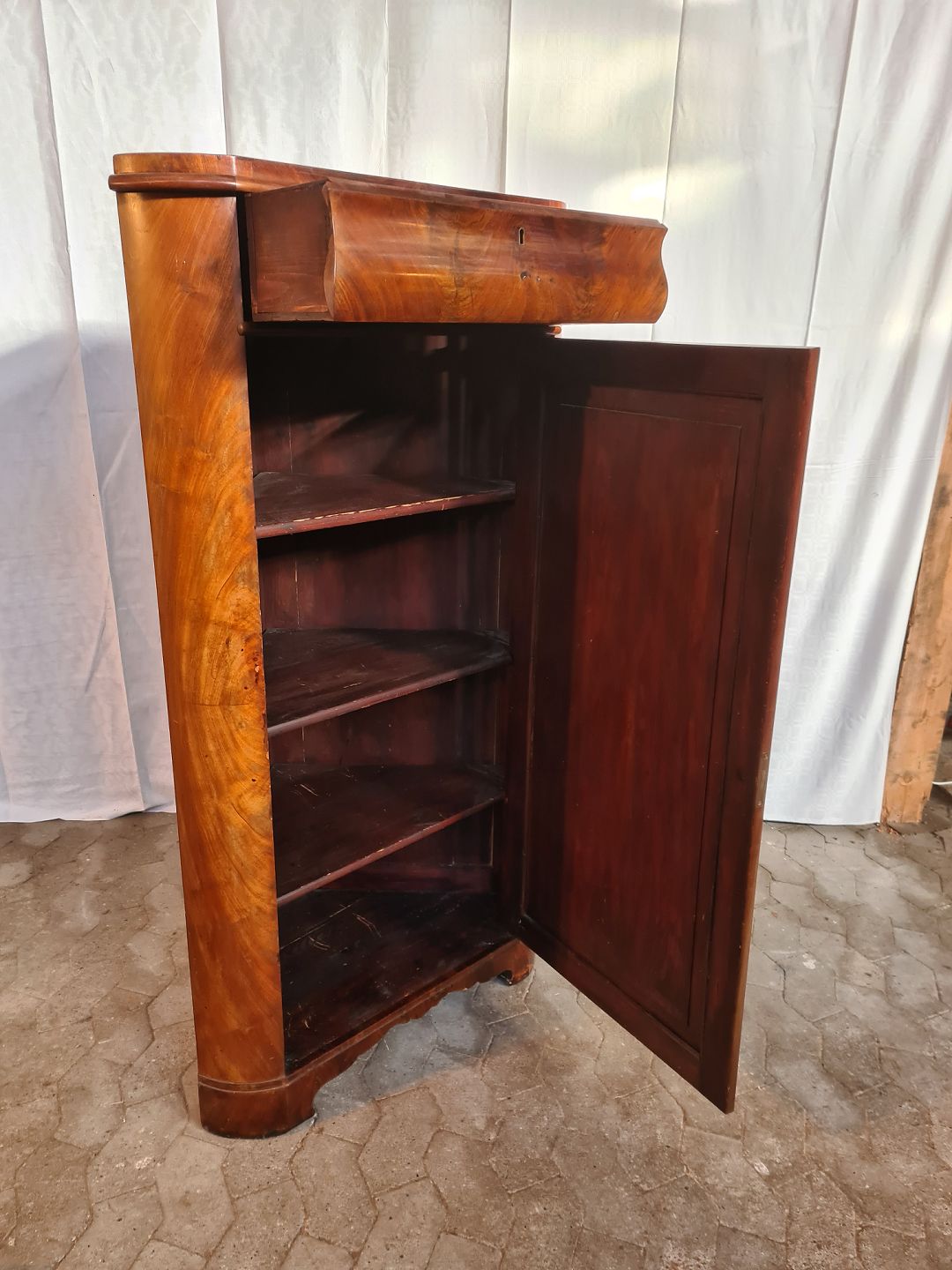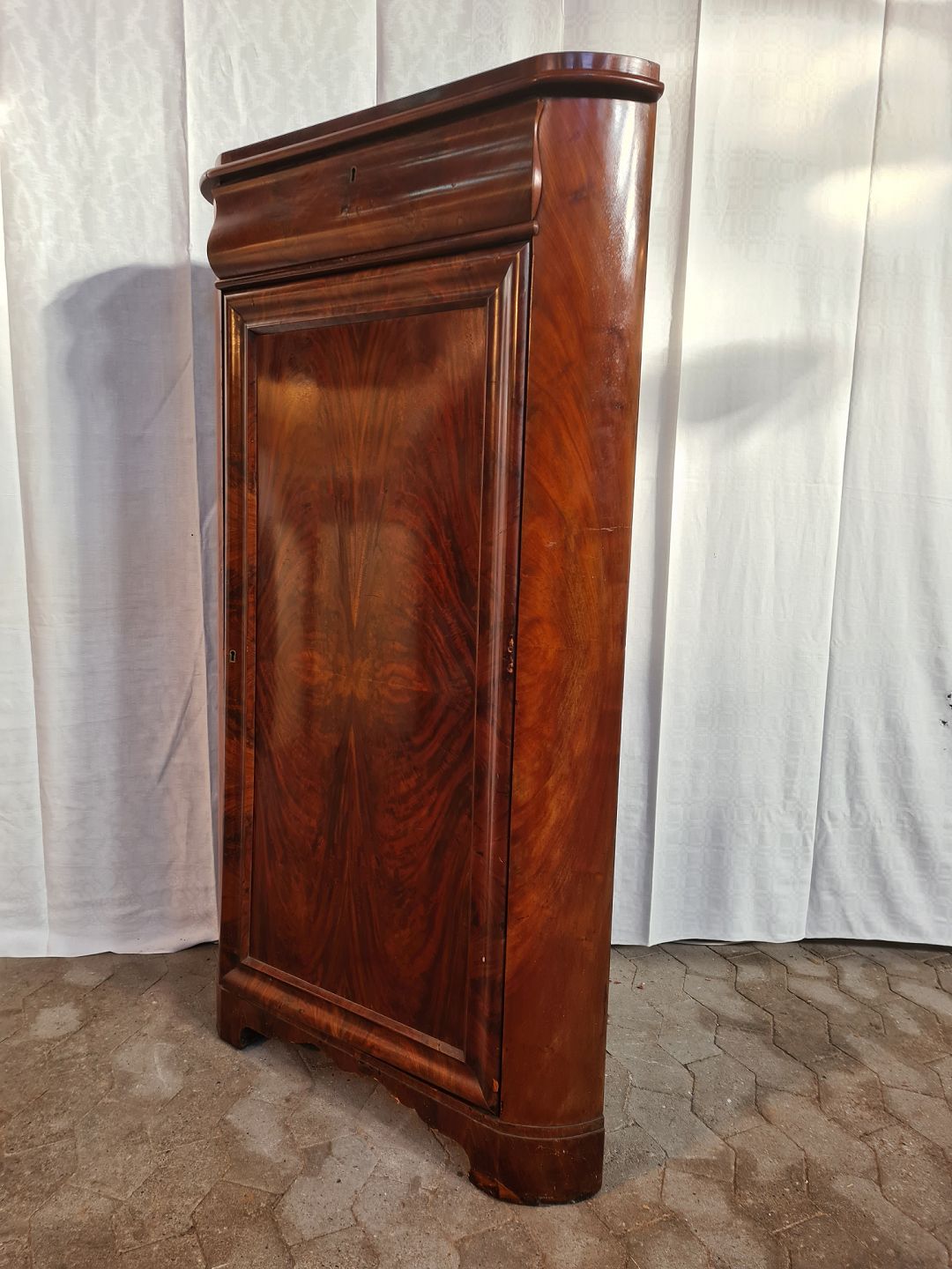 Hjørneskab i fineret mahogni, fra 1890erne.