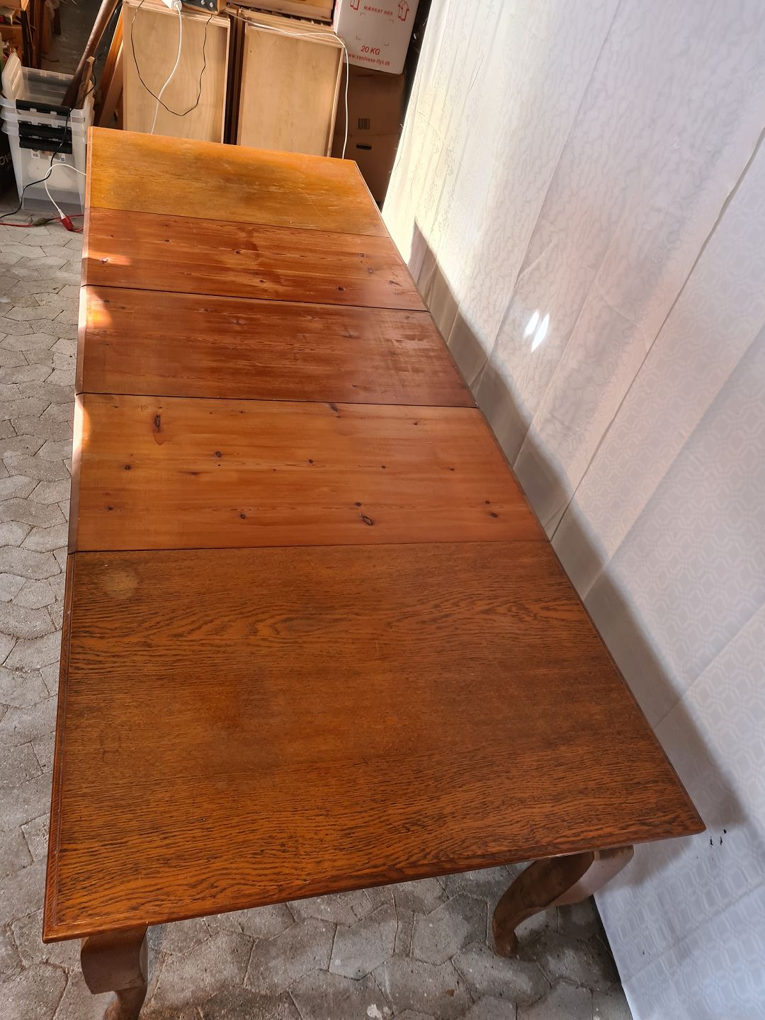 Spisebord i massivt egetræ med 3 tillægsplader, fra 1920erne.